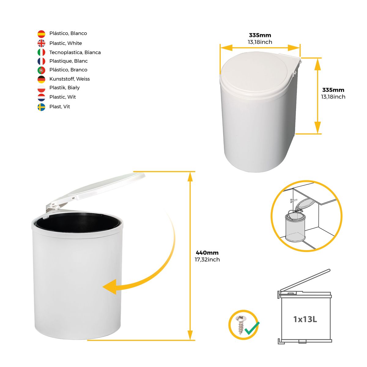 Contenitore di riciclaggio ideale per l'installazione sulle ante dei mobili della cucina aiutando alla raccolta diferenziata dei rifiuti e offrendo un acceso piú facile al secchio. Fabbricato in plastica colore bianco, grigio e inox , dispone d'una capacità di 13 litri ed é molto facile di montare dentro della maggiore parte dei mobili di cucina o di bagno con una larghezza interiore minima di 400mm. É valido sia con apertura di porta a sinistra che a destra. La pattumiera resta nascosta dentro il mobile en quanto che l'anta sia chiusa, però il coperchio si apre automaticamente quando la porta viene aperta.