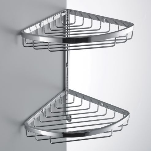 Angolare doppio per doccia Colombo Design Complementi con cestino, vaschetta e gancio finitura cromo.