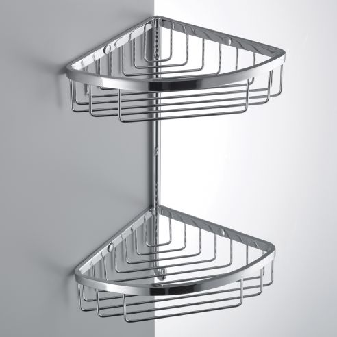 Angolare doppio per doccia Colombo Design Complementi con cestino, vaschetta e gancio finitura cromo.