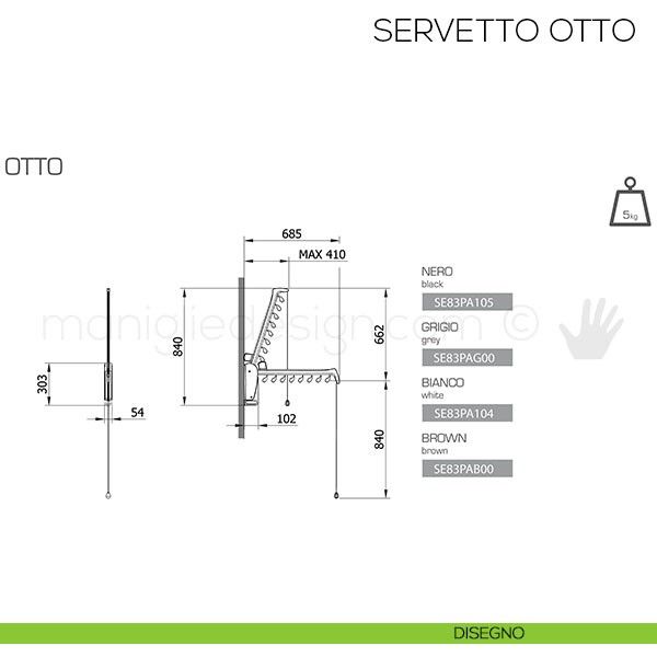 Otto appartiene alla linea di accessori Wall, elementi studiati per l'allestimento cabine armadio e pareti attrezzate. Peculiarità di questi accessori per cabine armadio è la struttura di supporto non a vista: delle piastre in materiale plastico permettono di montare gli elementi favorendo una rapida installazione e nascondendo il fissaggio a muro. Otto Servetto è il saliscendi per parete attrezzata ad un solo braccio dalle dimensioni contenute. E' un accessorio utile e occupa poco spazio; Otto può essere applicato in qualsiasi ambiente della casa.