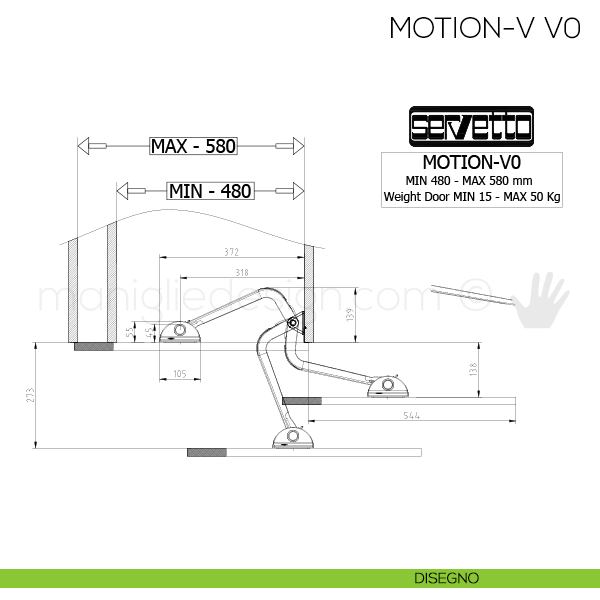 Sistema complanare per armadio Servetto Motion-V V0 per anta compresa tra 480-580 mm.