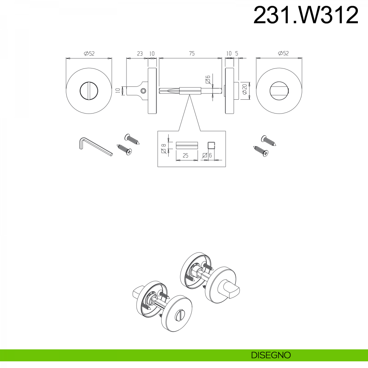 Nottolino in acciaio con rosetta tonda diametro 52 mm con quadro 6/8 mm articolo Fimet Inox. Design by Fimet Inox Project.