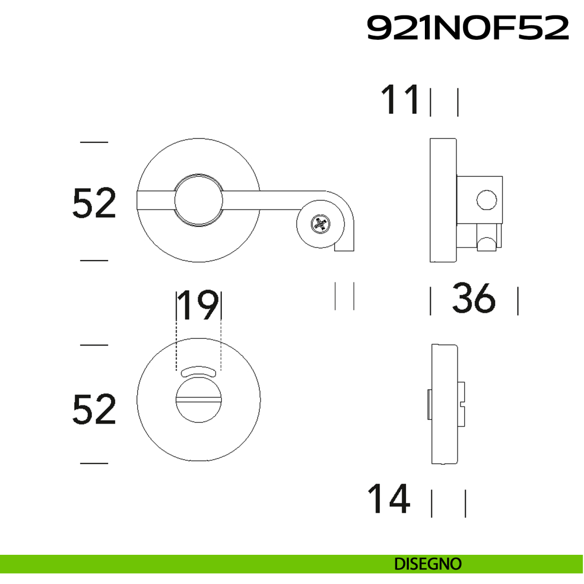 Chiusura per bagno libero/occupato a leva in acciaio satinato 316L con rosetta tonda misura ø52x10 mm con quadro 6/8 mm articolo 821 NO Reguitti Inox.