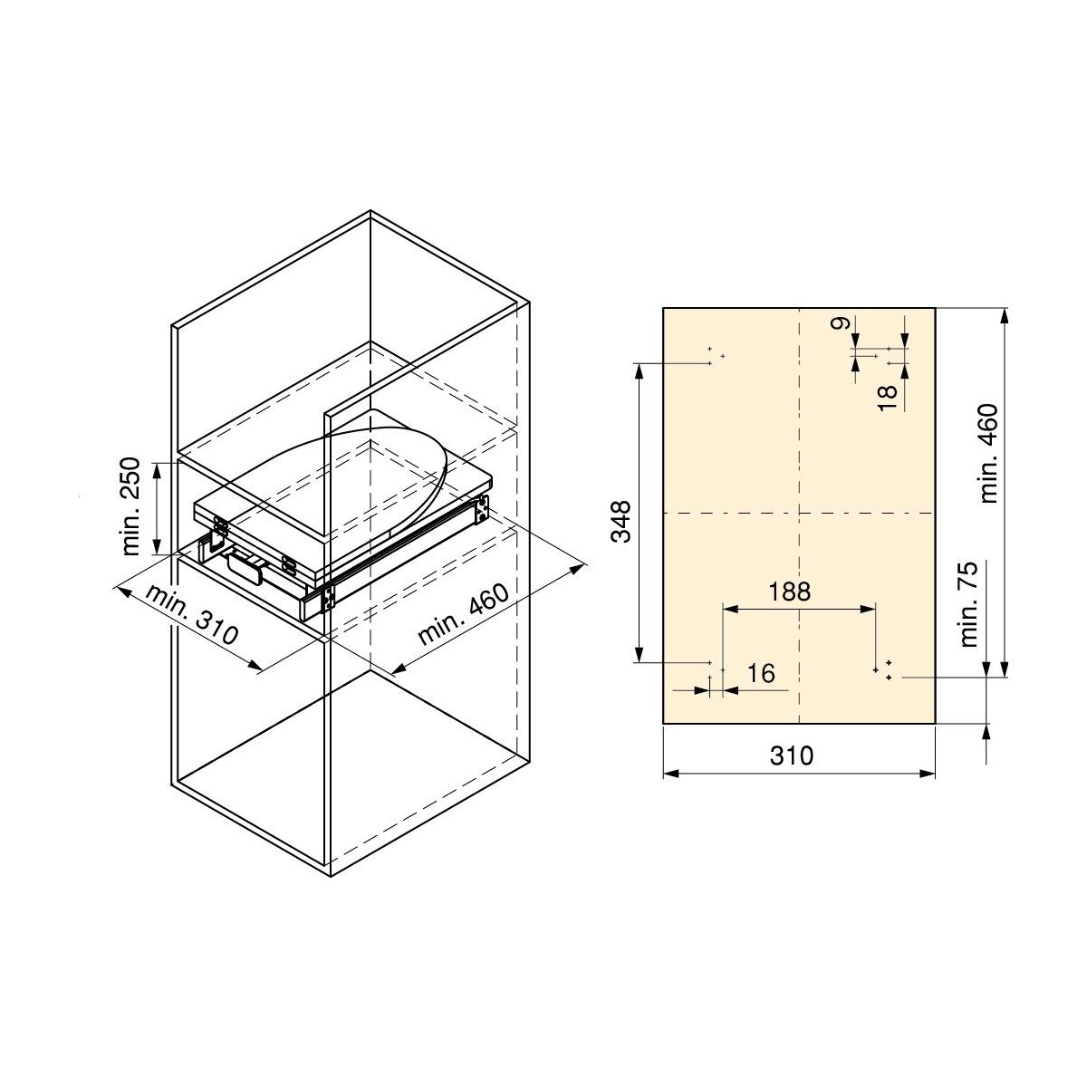 - Dimensioni minime dell'interno del mobile necessarie per il montaggio: 310 mm di apertura interna e 460 mm di profondità.