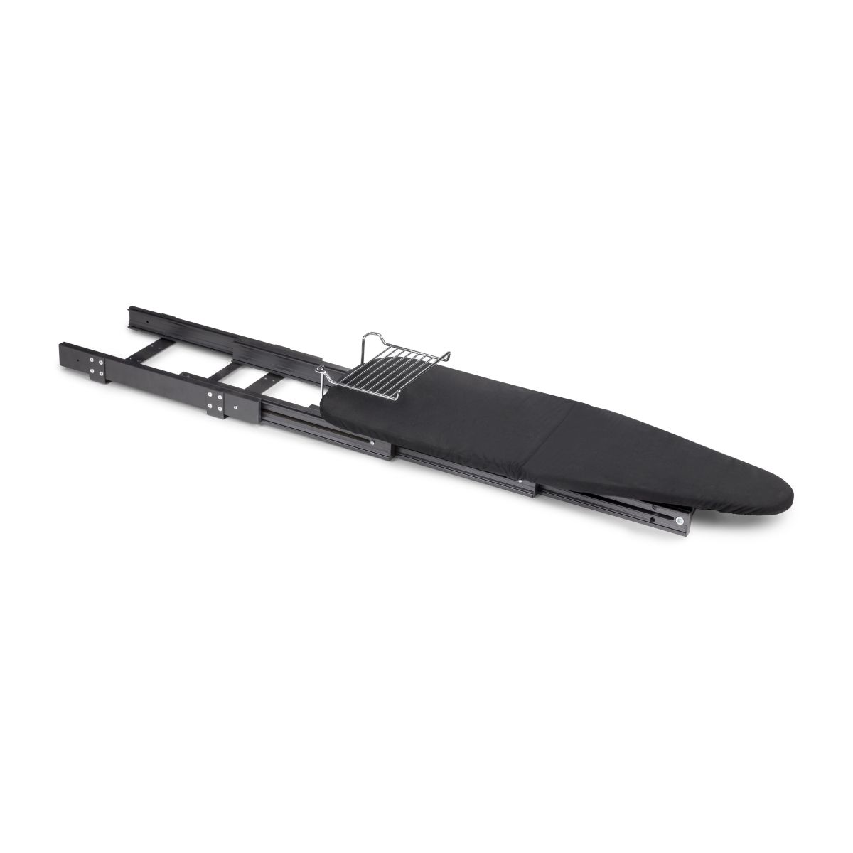 - L'asse da stiro può essere estratta dal mobile grazie a un sistema di pattini telescopici. È dotato di una maniglia per facilitare l'estrazione e di un sistema di aggancio per fissare l'asse in posizione aperta. Inoltre, è dotato di un supporto in acciaio per sostenere l'asse.