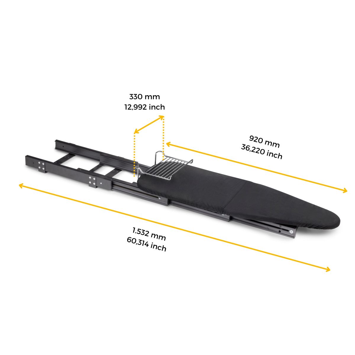 - Asse da stiro pieghevole ed estraibile da installare all'interno di un mobile, ha una superficie di stiro aperta di 920 mm di lunghezza e 330 mm di larghezza.
