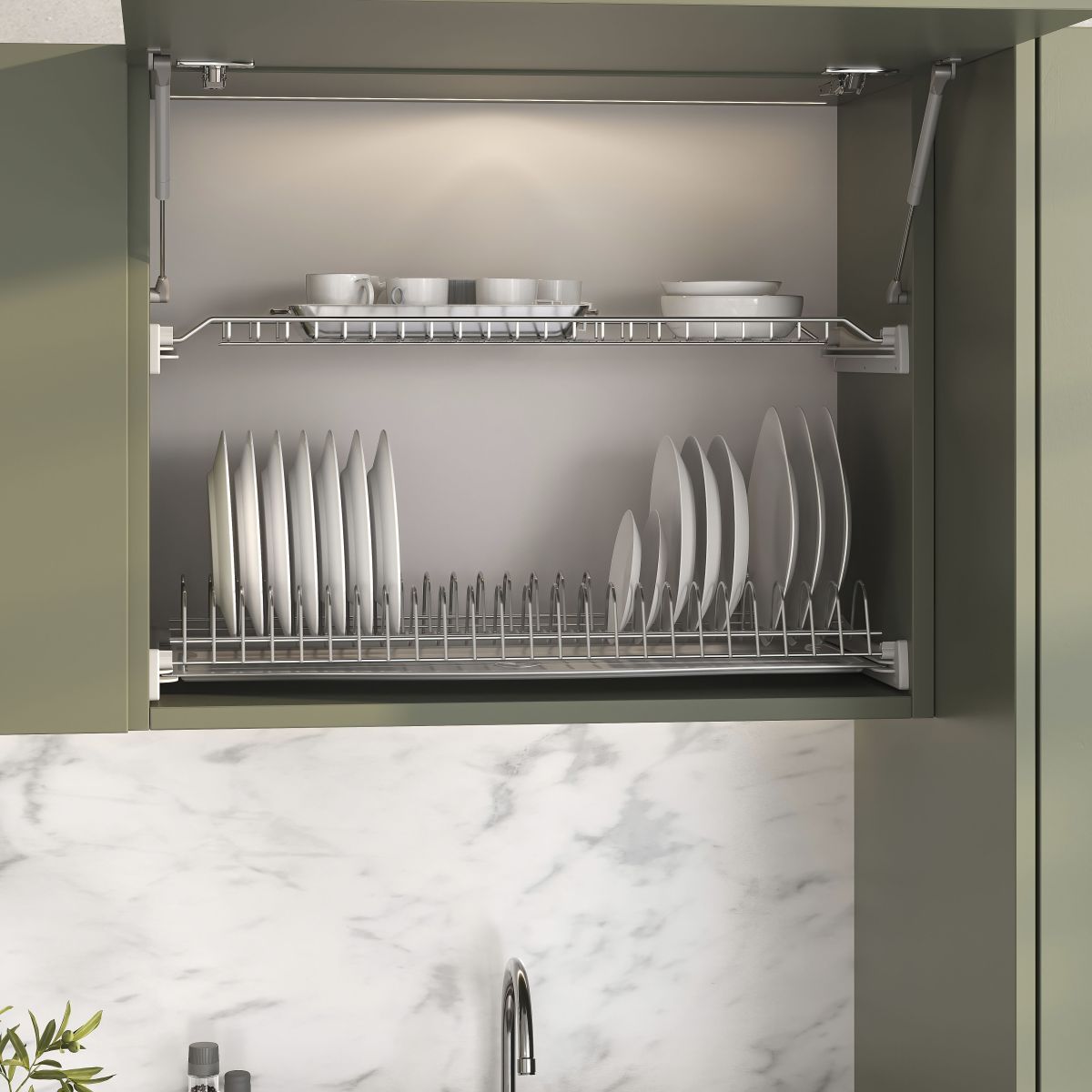 Lo scolapiatti Suprastar è progettato per organizzare le stoviglie negli armadietti della cucina. Ha un ripiano per i bicchieri e un altro per i piatti, con un vassoio di raccolta che impedisce all'acqua di danneggiare i mobili.