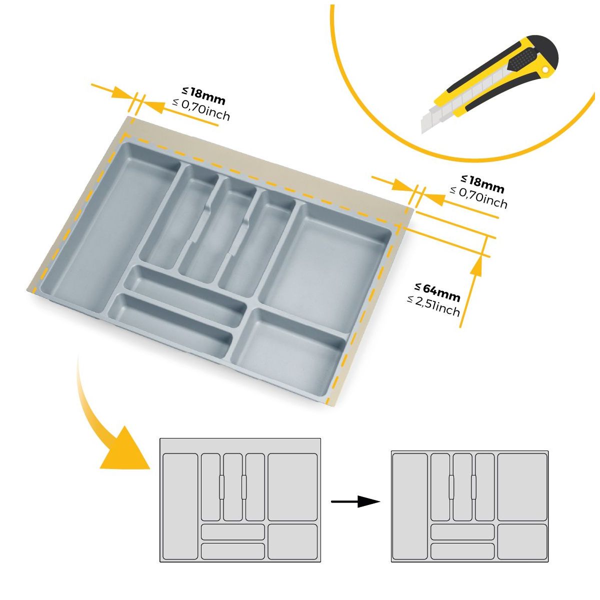 Portaposate per cassetti da cucina universale con un design lineare e grande capienza per posate ed altri utensili da cucina ottimizzando al massimo lo spazio. Poiché sono rifilabili possono essere dimensionati per l'uso con cassetti montati su moduli larghezza standard tra 400 mm e 900 mm , di profondità tra 450 mm e 500 mm con pannello di spessori tra 16 mm e 19 mm secondo il modulo selezionato