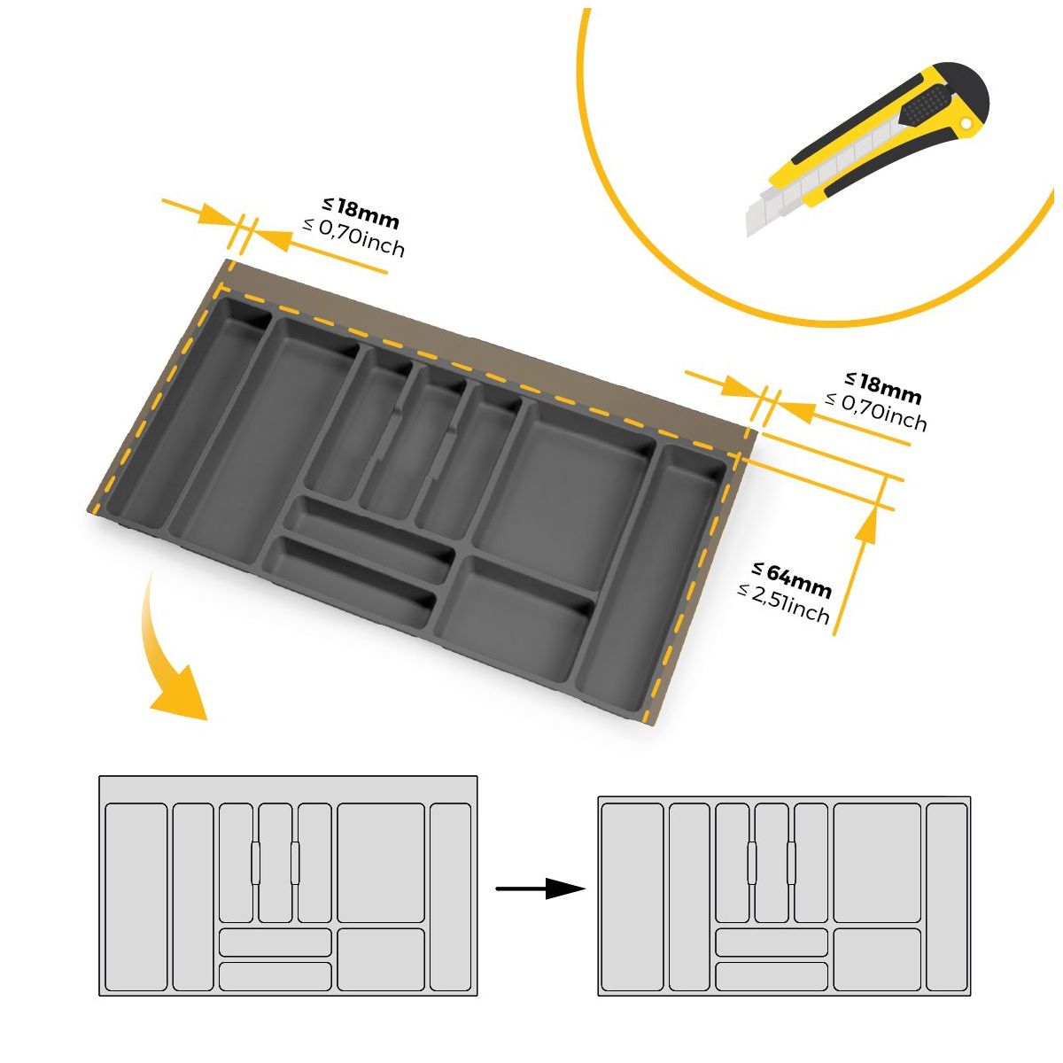 Portaposate per cassetti da cucina universale con un design lineare e grande capienza per posate ed altri utensili da cucina ottimizzando al massimo lo spazio. Poiché sono rifilabili possono essere dimensionati per l'uso con cassetti montati su moduli larghezza standard tra 400 mm e 900 mm , di profondità tra 450 mm e 500 mm con pannello di spessori tra 16 mm e 19 mm secondo il modulo selezionato