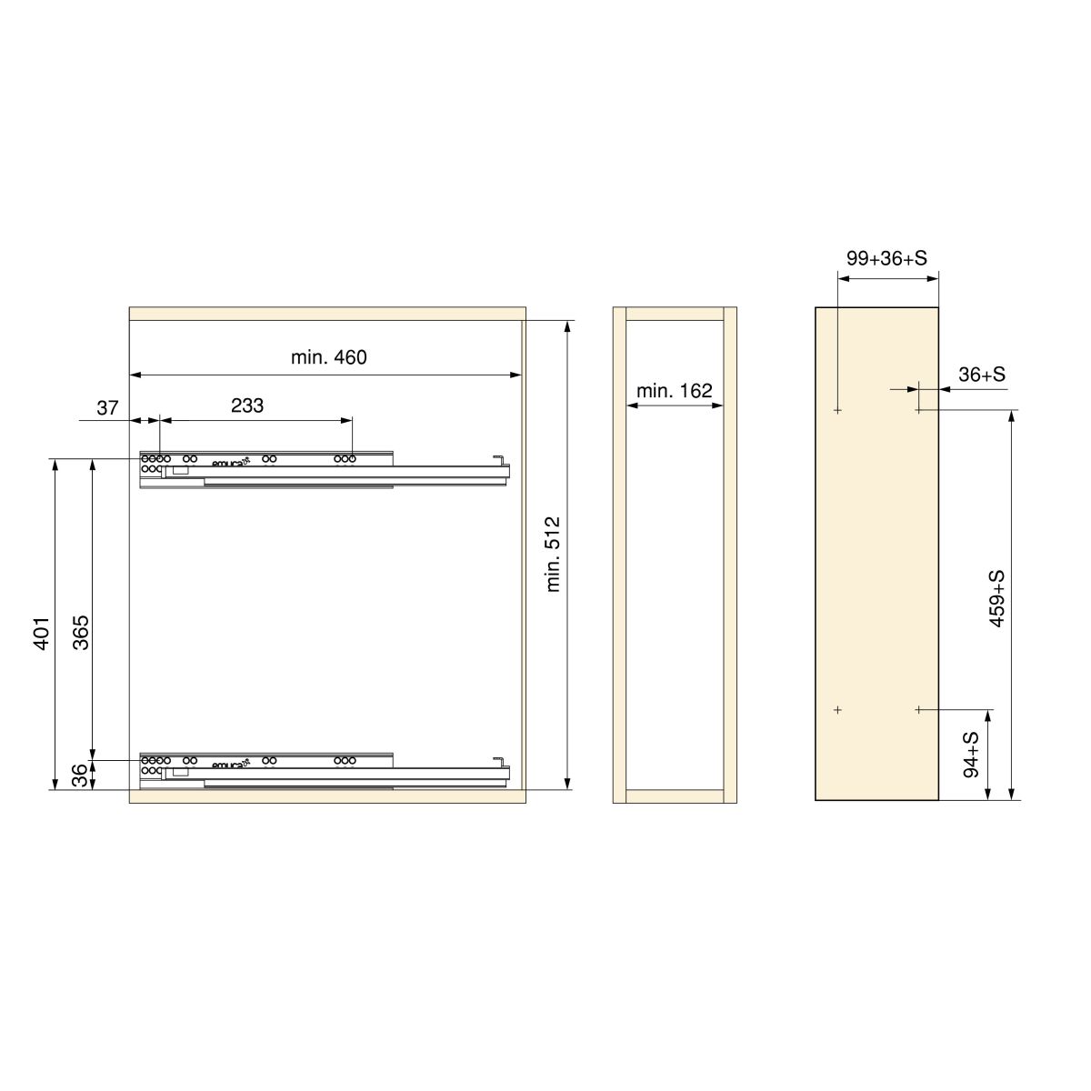 - Valido per moduli con larghezza interna minima di 162 mm e profondità minima di 460 mm. Compatibile con moduli con pannello da 16, 18 e 19 mm.
