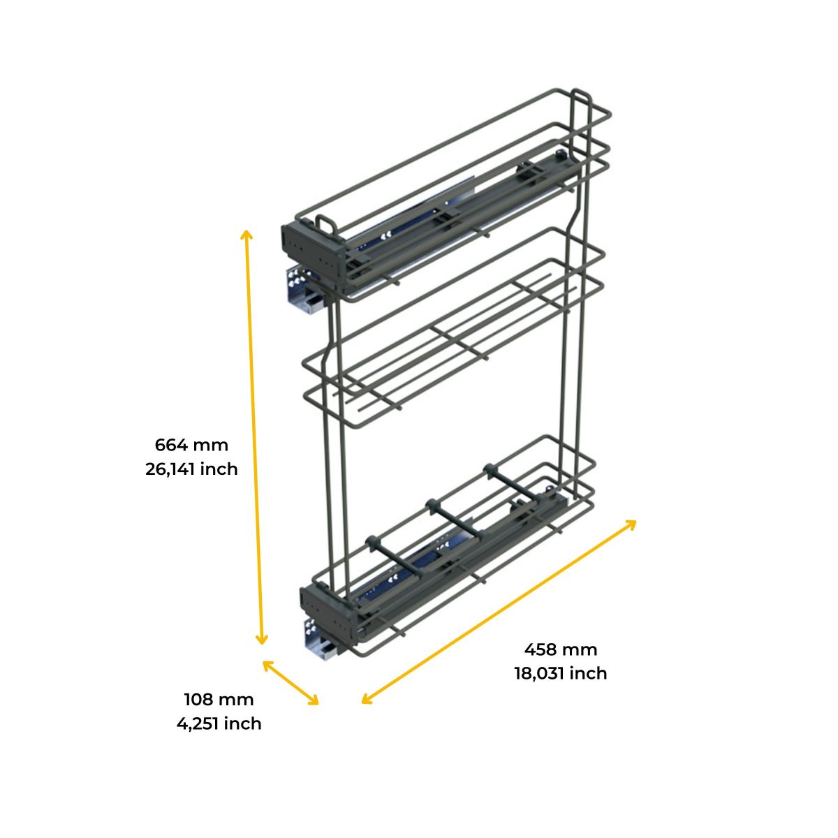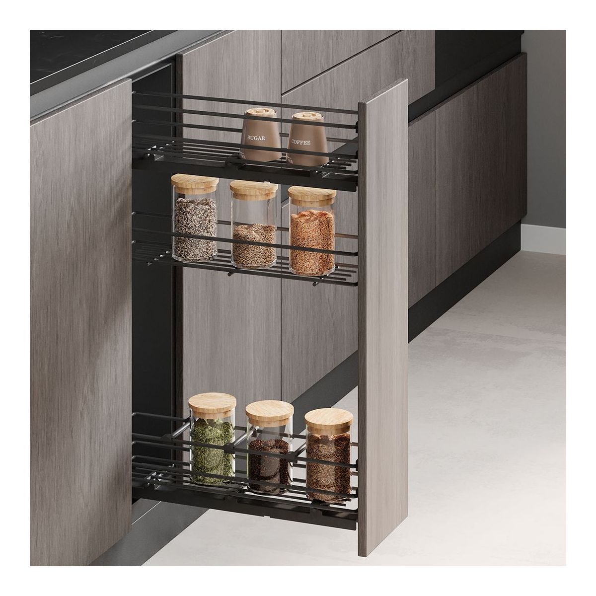 - Il portabottiglie estraibile TitaneMax dispone di tre livelli di stoccaggio e tre separatori nel cestello inferiore, permettendo di organizzare le bottiglie in modo efficiente. È la soluzione ideale per ottimizzare lo spazio nei moduli inferiori della cucina, soprattutto in spazi ridotti.