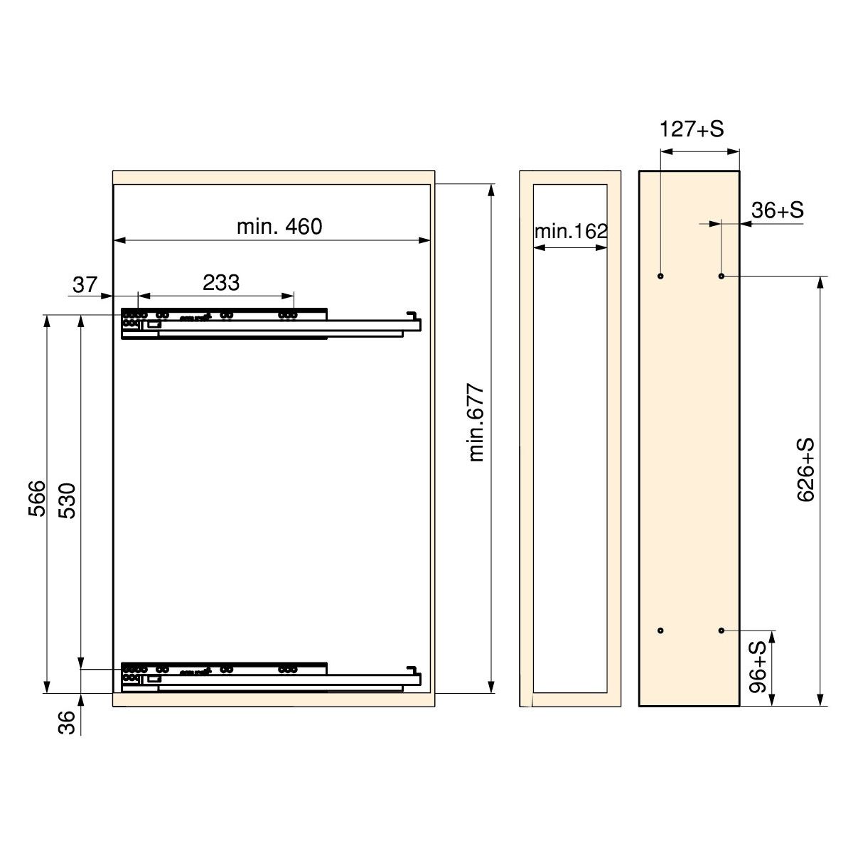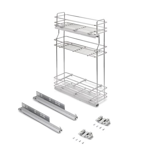 - Il montaggio avviene sul lato sinistro del mobile tramite due guide a rulli con estrazione totale e chiusura ammortizzata. Compatibile con pannelli di 16, 18 e 19 mm.