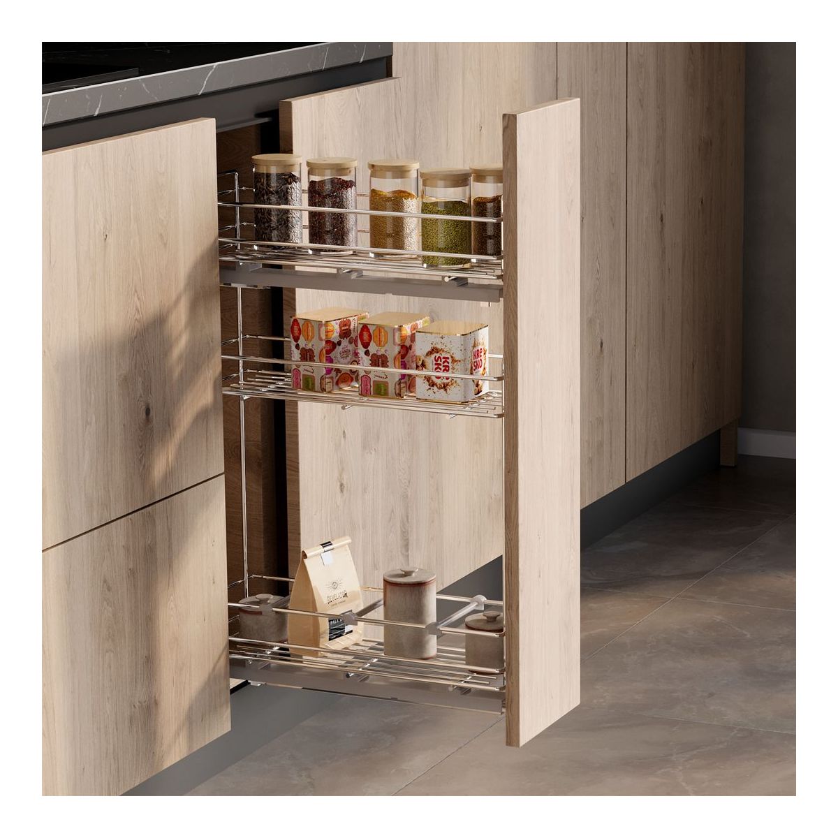 - Il portabottiglie estraibile SupraMax dispone di tre livelli di stoccaggio e tre separatori nel cestello inferiore, permettendo di organizzare le bottiglie in modo efficiente. È la soluzione ideale per ottimizzare lo spazio nei moduli inferiori della cucina, soprattutto in spazi ridotti.