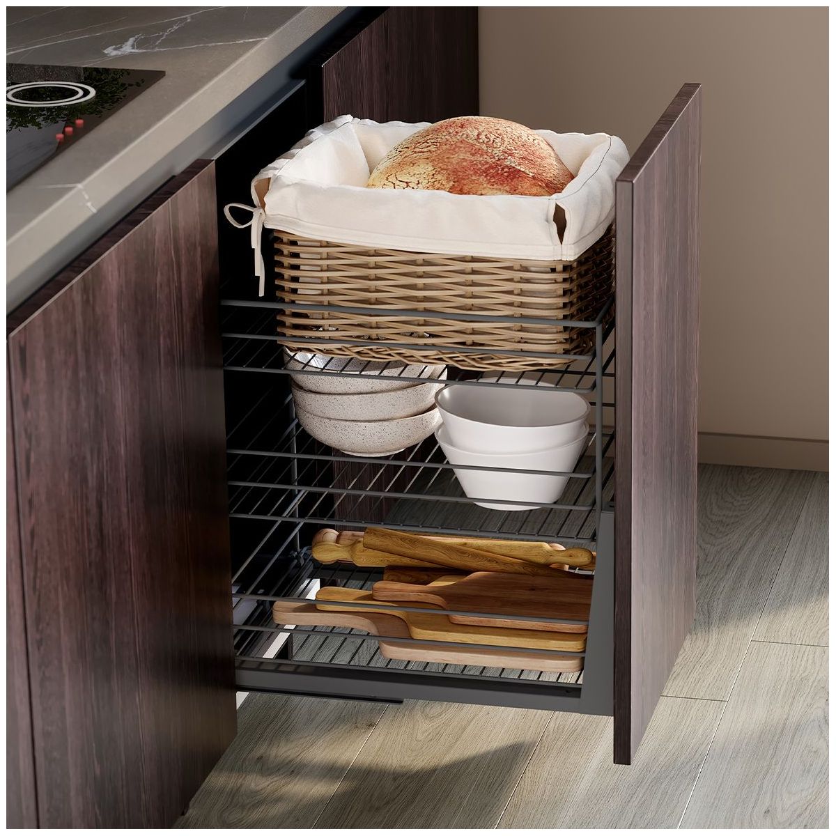 • Carrello estraibile Titane con fissaggio inferiore e chiusura morbida, progettato per massimizzare l'organizzatore nelle basi della cucina.