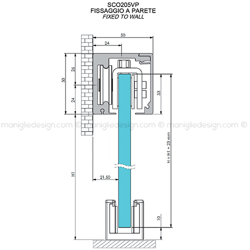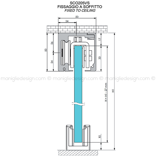 Scorrevole per vetro con veletta minimale fissaggio a parete e soffitto Comit Glass SCO205V.