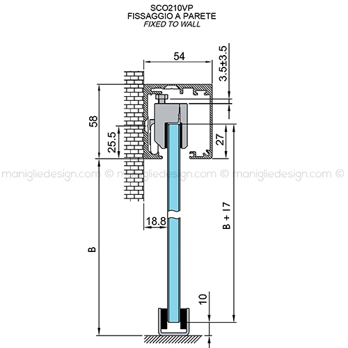 Scorrevole per vetro con veletta minimale e ammortizzatore fissaggio a parete e soffitto Comit Glass SCO210V1.