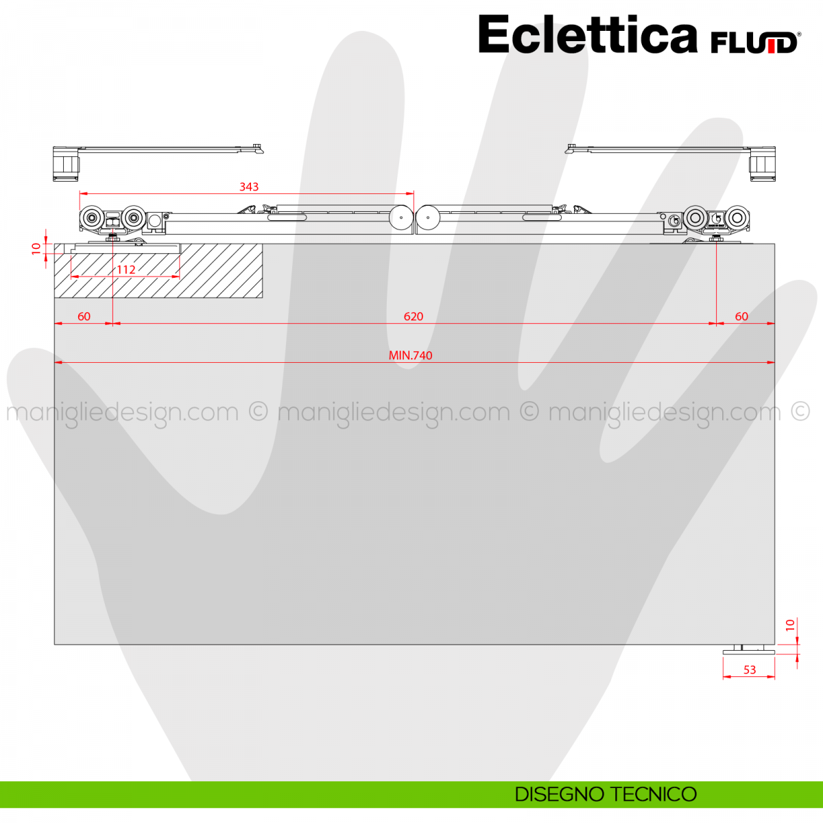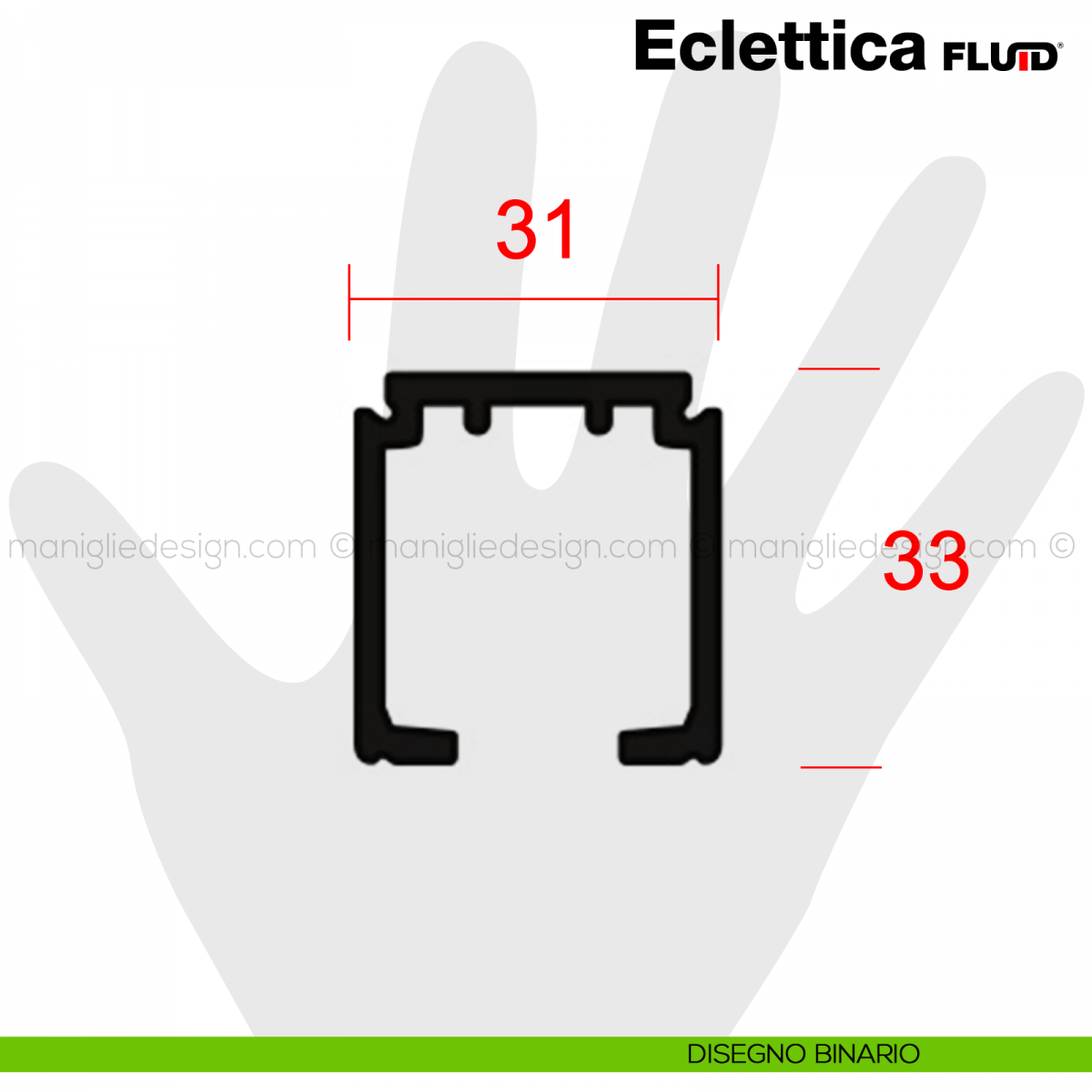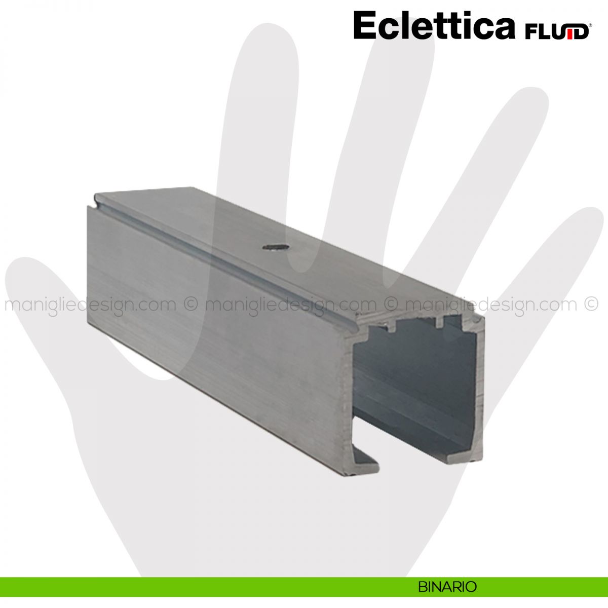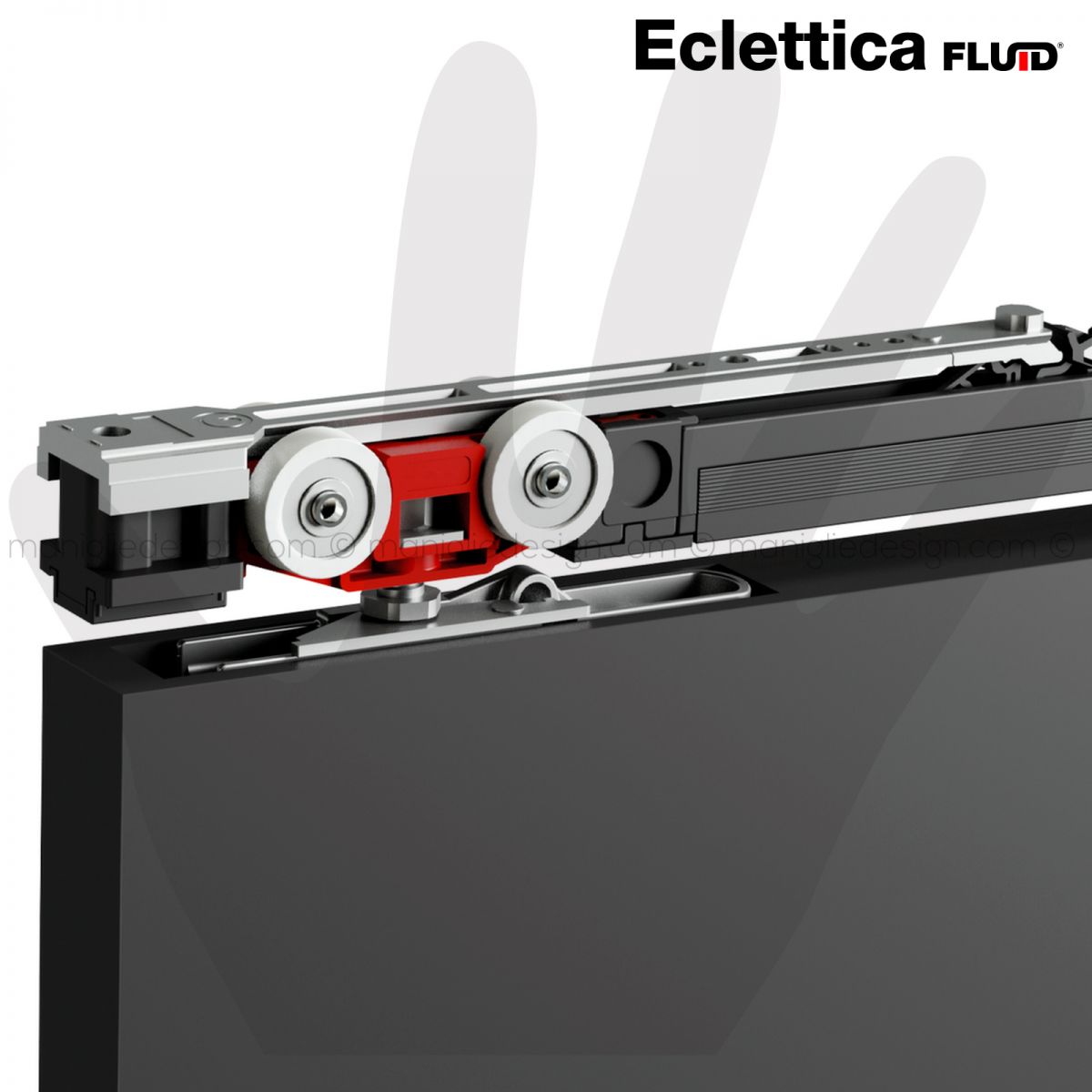 Eclettica Fluid Terno Scorrevoli, è il binario ammortizzato per porte scorrevoli con portata massima 120 kg per porta con staffe automatiche laterali e ammortizzatori Fluif Technology. Un prodotto brevettato e innovativo che coniuga ricerca estetica e funzionale in risposta concreta alle esigenze delle sfide sempre più complesse imposte dal mercato. Elevato contenuto estetico, facilità di montaggio, qualità di ogni singolo dettaglio, sono le carte vincenti che hanno reso all'avanguardia del design questa nuova guarnitura ammortizzata per porte scorrevoli. Il sistema altamente performante è dotato di carrelli con cuscinetti a rulli che garantiscono durabilità e silenziosità in fase di apertura e chiusura.