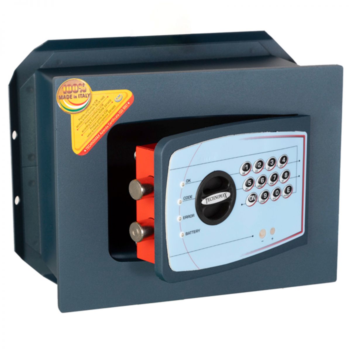 La cassaforte elettronica Gold Trony Technomax rappresenta la soluzione più pratica e allo stesso tempo evoluta per l'utilizzo. La casseforte a muro Gold Technomax ospita una serratura motorizzata certificata UNI EN 1300, controllata da un congegno elettronico ad alta affidabilità, dotata di memoria non volatile. Apertura e la chiusura avviene mediante manopola di comando e blocco con elettromagnete. La tastiera a membrana ha 4 leds dedicati ed incorpora i contatti per la batteria esterna. La cassaforte prevede le segnalazioni sonore e visive per conferma digitazione, errori e batterie interne in fase di esaurimento. La cassaforte viene alimentata da batterie alcaline da 1,5 V. I catenacci sono in acciaio nichelato, girevoli e diametro 22 mm. Per questo prodotto sono state progettate speciali battute della porta per una eccezionale resistenza ai tentativi di effrazione con l'uso di una mazza. Gold Trony ospita al suo interno un ripiano interno, per organizzare al meglio la disposizione dei propri preziosi. La verniciatura a polvere termoindurente con essicazione a forno fanno di Gold Technomax un prodotto di altissimo livello.