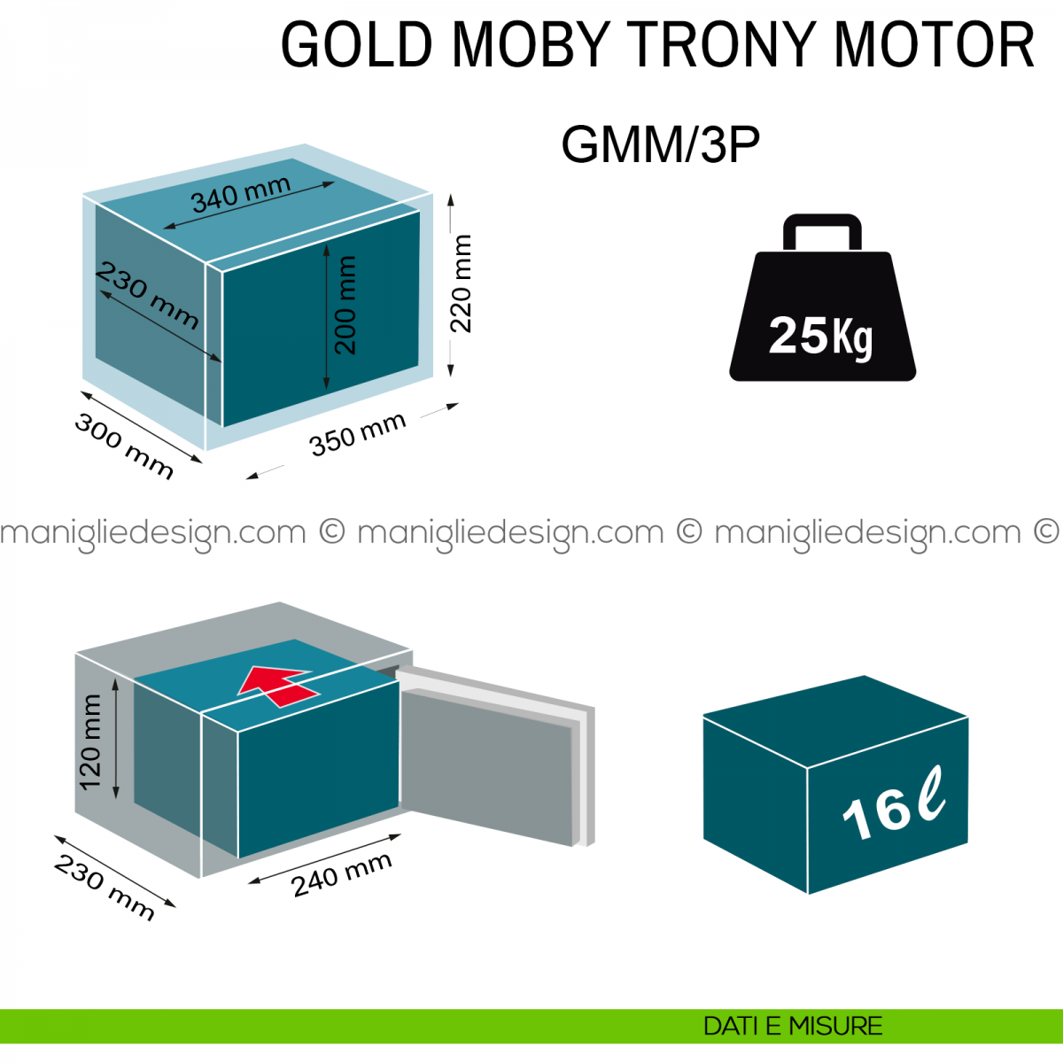 La cassaforte elettronica Gold Moby Trony Motor Technomax rappresenta la soluzione più pratica e allo stesso tempo evoluta per l'utilizzo. La cassaforte a mobile Gold Moby Trony Motor Technomax ospita una serratura motorizzata certificata UNI EN 1300, controllata da un congegno elettronico ad alta affidabilità, dotata di memoria non volatile con un ritardo di apertura programmabile da 0 a 99 minuti. Ha una apertura di emergenza con serratura certificata UNi EN 1300 a chiave doppia mappa con profilo speciale, duplicabile con la carta di proprietà numerata per prevenire la duplicazione non autorizzata delle chiavi. La tastiera a membrana ha 4 leds dedicati ed incorpora i contatti per la batteria esterna. La cassaforte viene alimentata da batterie alcaline da 1,5 V ed è dotata di illuminazione interna a LED all'apertura della porta. I catenacci sono in acciaio nichelato, girevoli e diametro 22 mm. Per questo prodotto sono state progettate speciali battute della porta per una eccezionale resistenza ai tentativi di effrazione con l'uso di una mazza. Gold Moby Trony ospita al suo interno un ripiano interno, per organizzare al meglio la disposizione dei propri preziosi. La verniciatura a polvere termoindurente con essicazione a forno fanno di Gold Moby Trony Motor Technomax un prodotto di altissimo livello.