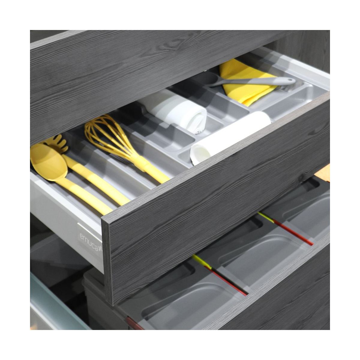Portaposate per cassetti da cucina universale con un design lineare e grande capienza per posate ed altri utensili da cucina ottimizzando al massimo lo spazio. Poiché sono rifilabili possono essere dimensionati per l'uso con cassetti montati su moduli larghezza standard tra 400 mm e 900 mm , di profondità tra 450 mm e 500 mm con pannello di spessori tra 16 mm e 19 mm secondo il modulo selezionato