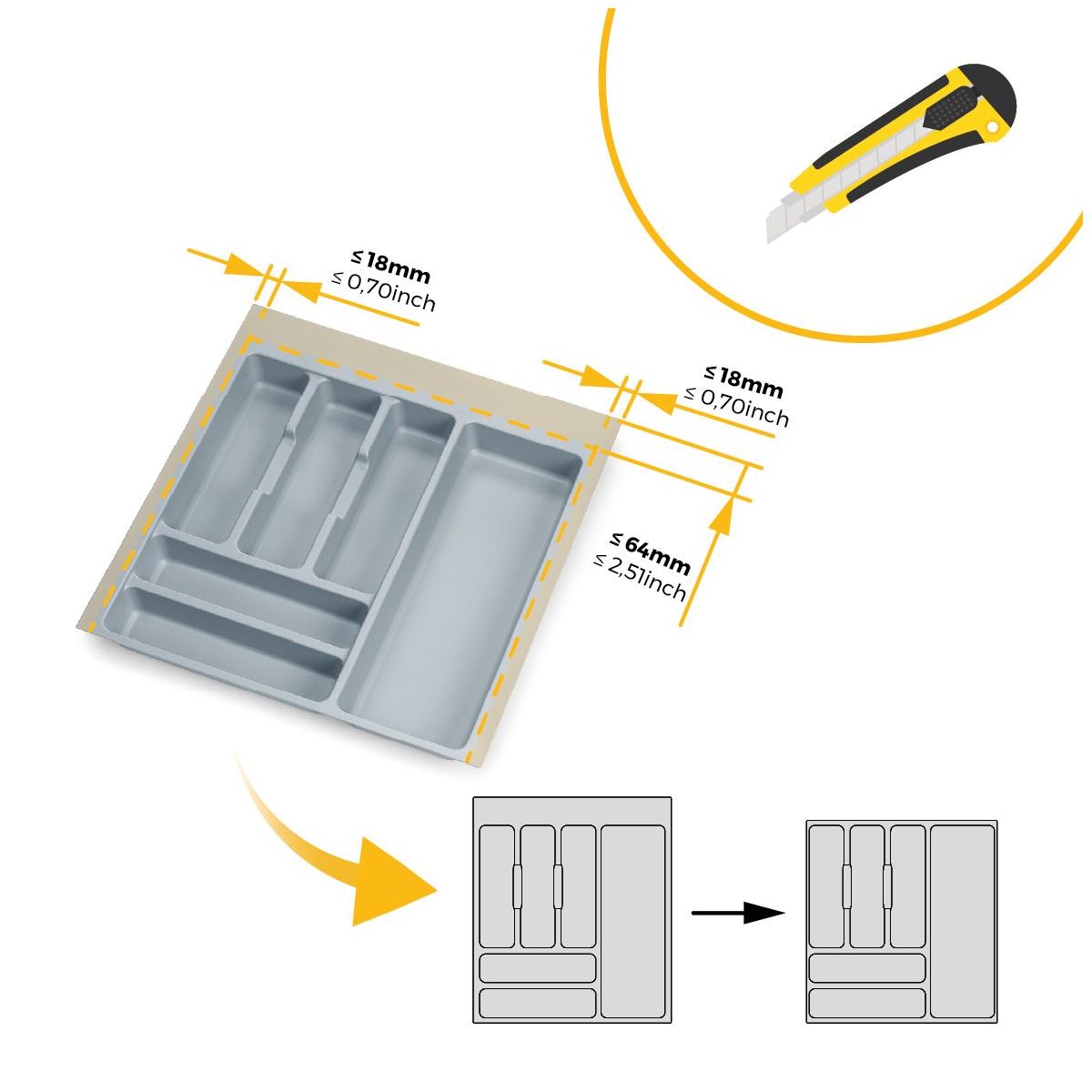 • Cubertero di dimensioni 436x482 mm progettato per cassetti con modulo di larghezza di 500 mm.