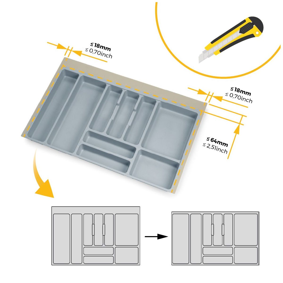 • Cubertero di dimensioni 736x482 mm progettato per cassetti con modulo di larghezza di 800 mm.