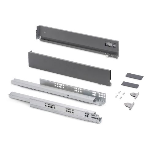Kit per cassetto cucina e bagno Vertex con tutti gli elementi necessari per il suo assemblaggio. È la soluzione ottimale per i mobili della tua cucina, bagno o armadio con un design elegante. Ogni kit è composto da tutti gli elementi necessari per il montaggio di un cassetto esterno di 83mm di altezza, progettati per uno spessore del pannello di 16mm, sia per il fondo che per il retro del cassetto. Include: due sponde laterale, un set di guide con chiusura soft, un set di coperchi di rivestimento e i fissaggi per la parte anteriore del cassetto.Le sponde laterale in metallo sono realizzate in acciaio con finitura verniciato grigio antracite, ha una regolazione frontale 3D: verticale tramite eccentrici di ±2 mm, orizzontale ±1 mm, inclinazione -1,5/+4 mm. Le guide sono di estrazione totale con chiusura ammortizzata e hanno una capacità di carico massima di 40 Kg per il cassetto.Avrà solo bisogno dei pannelli tagliati della dimensione corretta per il fondo, la schiena e il frontalino del cassetto.