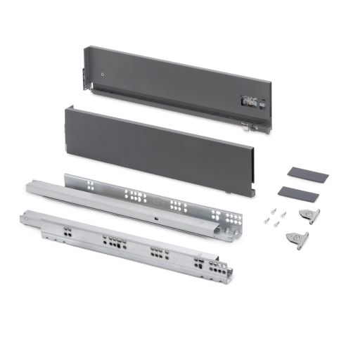 Kit per cassetto cucina e bagno Vertex con tutti gli elementi necessari per il suo assemblaggio. È la soluzione ottimale per i mobili della tua cucina, bagno o armadio con un design elegante. Ogni kit è composto da tutti gli elementi necessari per il montaggio di un cassetto esterno di 131mm di altezza, progettati per uno spessore del pannello di 16mm, sia per il fondo che per il retro del cassetto. Include: due sponde laterale, un set di guide con chiusura soft, un set di coperchi di rivestimento e i fissaggi per la parte anteriore del cassetto.Le sponde laterale in metallo sono realizzate in acciaio con finitura verniciato grigio antracite, ha una regolazione frontale 3D: verticale tramite eccentrici di ±2 mm, orizzontale ±1 mm, inclinazione -1,5/+4 mm. Le guide sono di estrazione totale con chiusura ammortizzata e hanno una capacità di carico massima di 60kg per il cassetto.Avrà solo bisogno dei pannelli tagliati della dimensione corretta per il fondo, la schiena e il frontalino del cassetto.