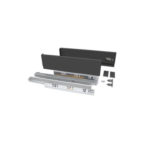 Kit per cassetto cucina e bagno Vertex con tutti gli elementi necessari per il suo assemblaggio. È la soluzione ottimale per i mobili della tua cucina, bagno o armadio con un design elegante in colore grigio antracite. Ogni kit è composto da tutti gli elementi necessari per il montaggio di un cassetto esterno di 93mm di altezza, progettati per uno spessore del pannello di 18mm, sia per il fondo che per il retro del cassetto. Include: due sponde laterale, un set di guide con chiusura soft, un set di coperchi di rivestimento e i fissaggi per la parte anteriore del cassetto.