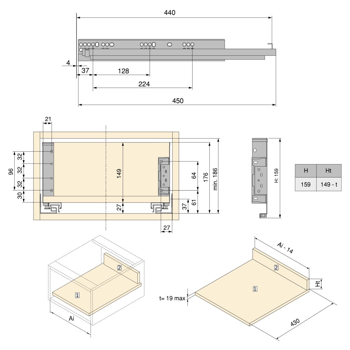 - Ha un’altezza di 159 mm con un design elegante, per cassetti con una profondità di 440 mm, che offre grande capacità interna e una finitura moderna.