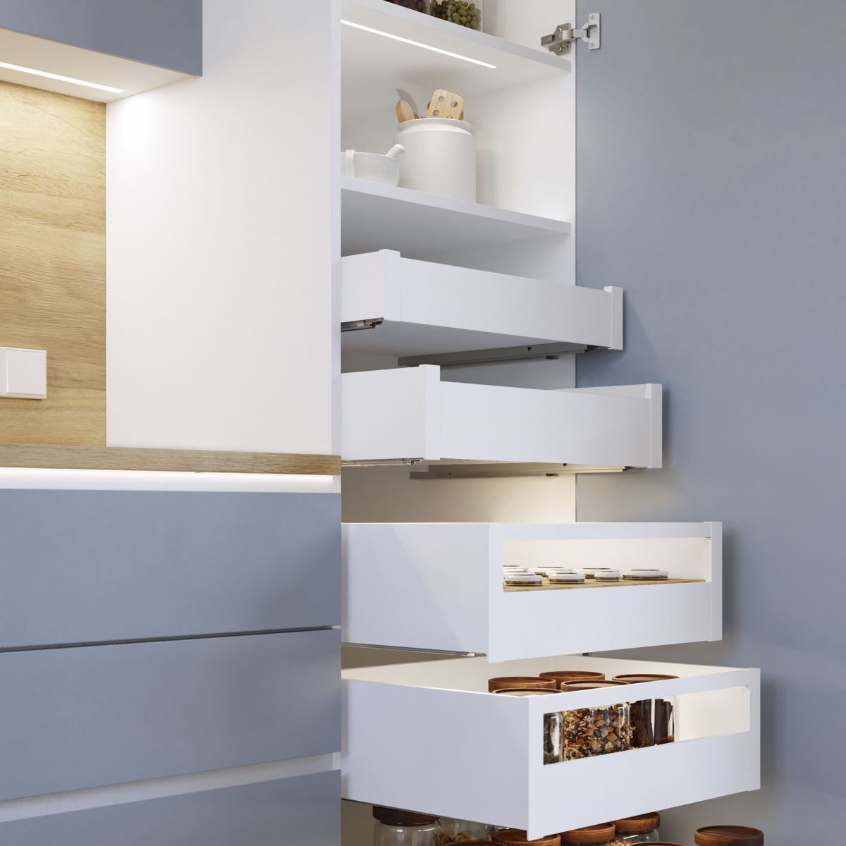 Il cassetto da cucina e bagno Protone è disponibile in formato kit con tutti gli accessori necessari per il montaggio. Si distingue inoltre per la sua grande capacità di carico , sopporta fino a 30 kg per cassetto. Include guide di estrazione totale con una chiusura soft , set di ganci e profili disponibili con finiture verniciate bianco o grigio antracite. Avrà solo bisogno dei pannelli tagliati della dimensione corretta per il fondo, la schiena e il frontalino del cassetto.