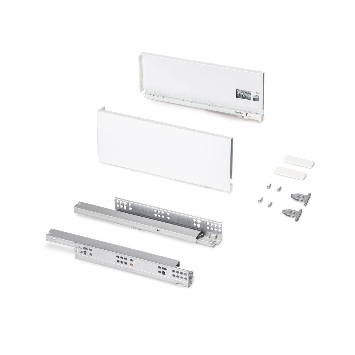 • Include di guide ad estrazione totale, set di profili e un set di ganci frontali per cassetto esterno.