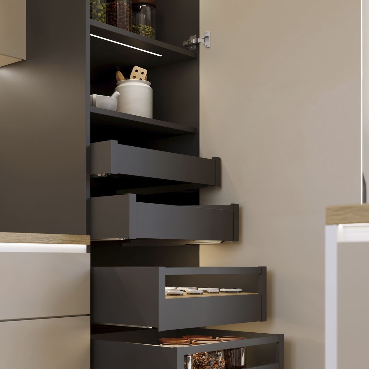 Il cassetto da cucina e bagno Protone è disponibile in formato kit con tutti gli accessori necessari per il montaggio. Si distingue inoltre per la sua grande capacità di carico , sopporta fino a 30 kg per cassetto. Include guide di estrazione totale con una chiusura soft , set di ganci e profili disponibili con finiture verniciate bianco o grigio antracite. Avrà solo bisogno dei pannelli tagliati della dimensione corretta per il fondo, la schiena e il frontalino del cassetto.