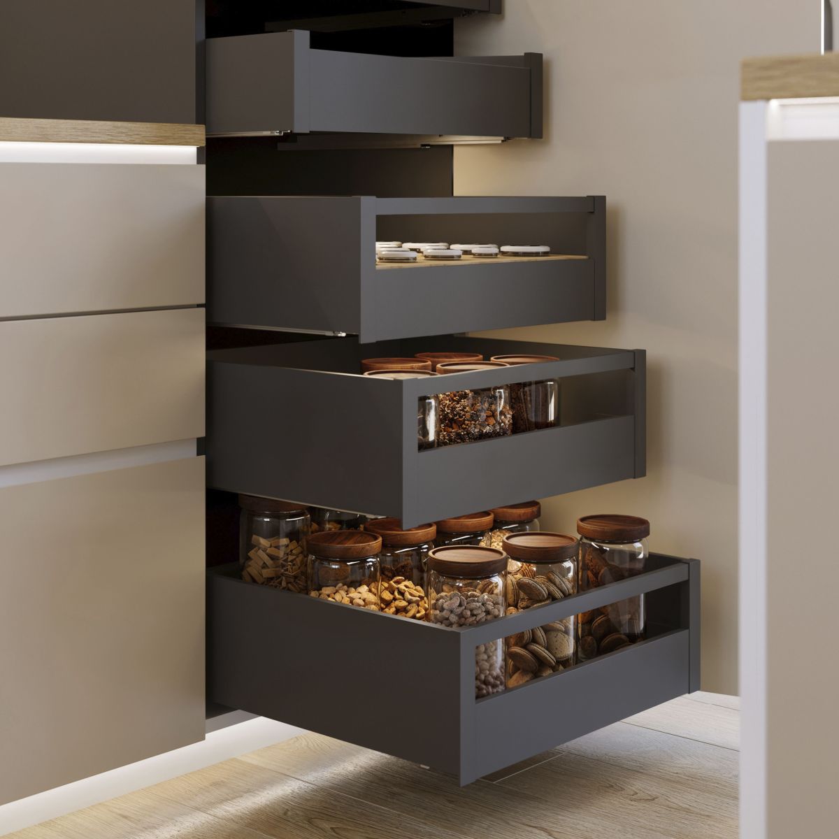 Il cassetto da cucina e bagno Protone è disponibile in formato kit con tutti gli accessori necessari per il montaggio. Si distingue inoltre per la sua grande capacità di carico , sopporta fino a 30 kg per cassetto. Include guide di estrazione totale con una chiusura soft , set di ganci e profili disponibili con finiture verniciate bianco o grigio antracite. Avrà solo bisogno dei pannelli tagliati della dimensione corretta per il fondo, la schiena e il frontalino del cassetto.