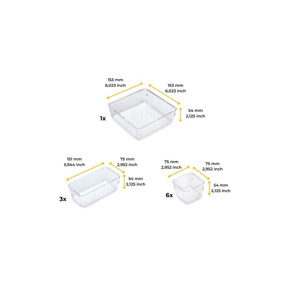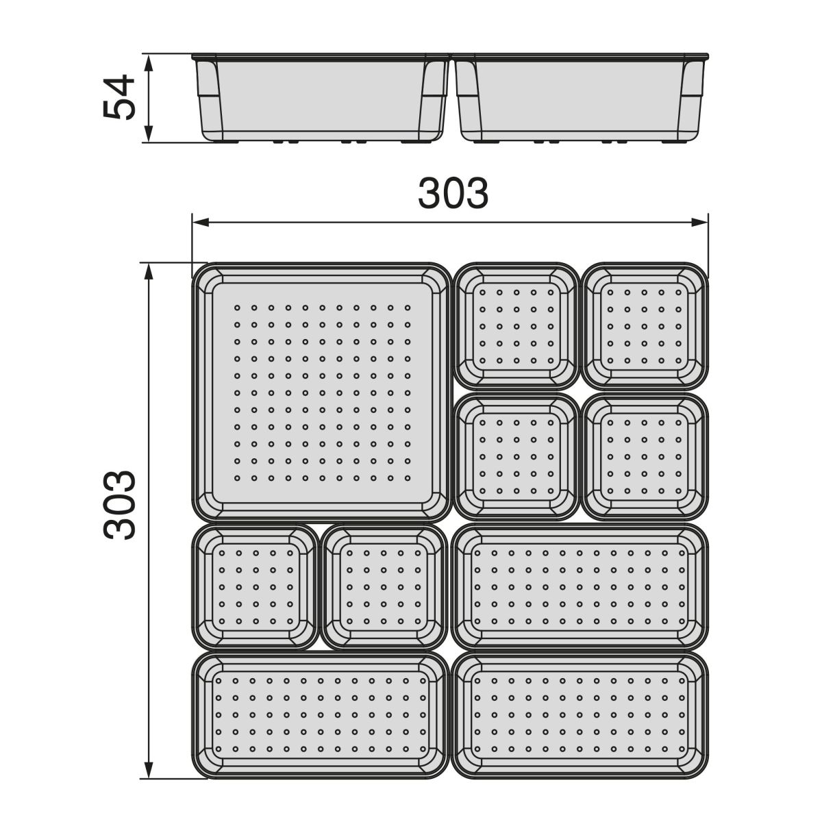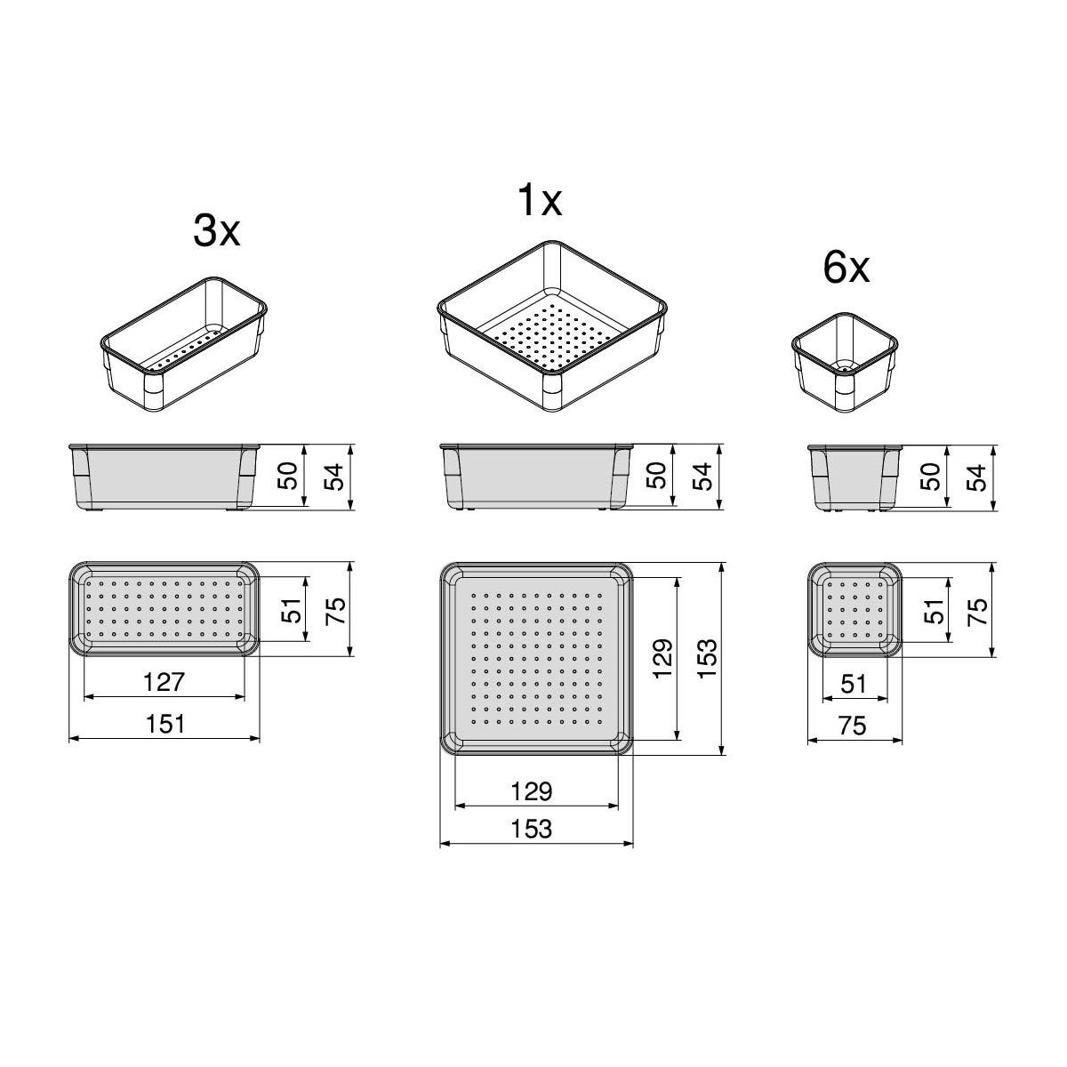 6 secchi di 75x75x54 mm, 3 secchi di 75x151x54 mm, 1 secchio di 153x153x54 mm e 40 perline in silicone