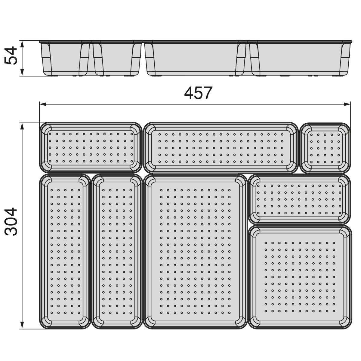 - Il kit è composto da 1 secchio di 75x75x54 mm, 2 secchi di 75x151x54 mm, 1 secchio di 153x153x54 mm, 3 secchi di 76x228x54 mm e 1 secchio di 228x154x54 mm. La disposizione dei secchi all'interno del cassetto è personalizzabile.