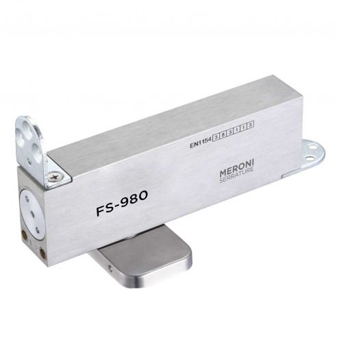 La cerniera per porta a bilico FS980 Meroni è il nuovo sistema di apertura per porte pivot robusta e veloce da installare, adatta sia su porte in legno ed alluminio. Il modello FS980 è una cerniera chiudiporta a pavimento con forza fissa (EN 3) per installazione su porte in legno o alluminio, disponibile nella versione standard (esercita la sola funzione di chiusura della porta) e nella versione hold-open (oltre alla chiusura della porta, consente il bloccaggio a 90°). Tutti i modelli sono ambidestri, installabili su porte con apertura destra o sinistra, conformi alla norma EN 1154, disponibili in finitura acciaio inox satinato.