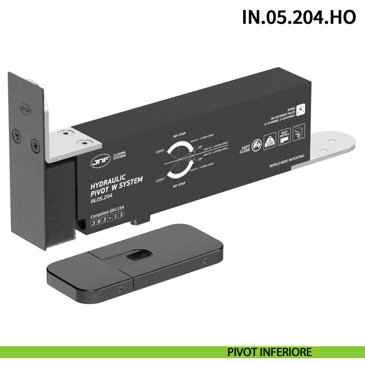Cerniera pivot idraulica a pavimento JNF IN.05.204.HO modello 100 EDGE con chiusura automatica e portata 100 kg, ideale per porte a bilico in legno, alluminio o metallo con larghezza massima 1000 mm, spessore 40 mm e velocità di chiusura regolabile in finitura satinata.