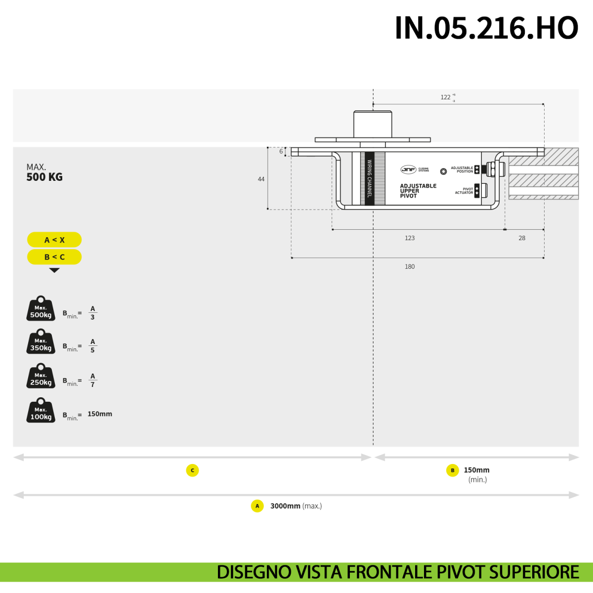 Cerniera pivot idraulica a pavimento JNF IN.05.216.HO modello 500 PLUS con chiusura automatica e portata 500 kg, ideale per porte a bilico di grandi dimensioni in legno, alluminio o metallo con larghezza massima 3000 mm e altezza massima 8000 mm, spessore minimo della porta 50 mm e velocità di chiusura regolabile, funzione passa cavi, in finitura satinata.