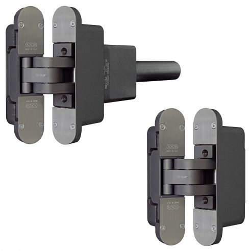 Kit cerniere a scomparsa autochiudente regolabile AGB Eclipse Self per porta a filo con apertura fino a 125° con portata fino a 100 kg e chiusura controllata, composto da una cerniera con meccanismo oleodinamico e chiudiporta integrato e da una cerniera senza meccanismo, idoneo per porte tagliafuoco, porte hotel, in legno e in metallo e porte blindate a filo sia esterne che interne, completo di coperture.
