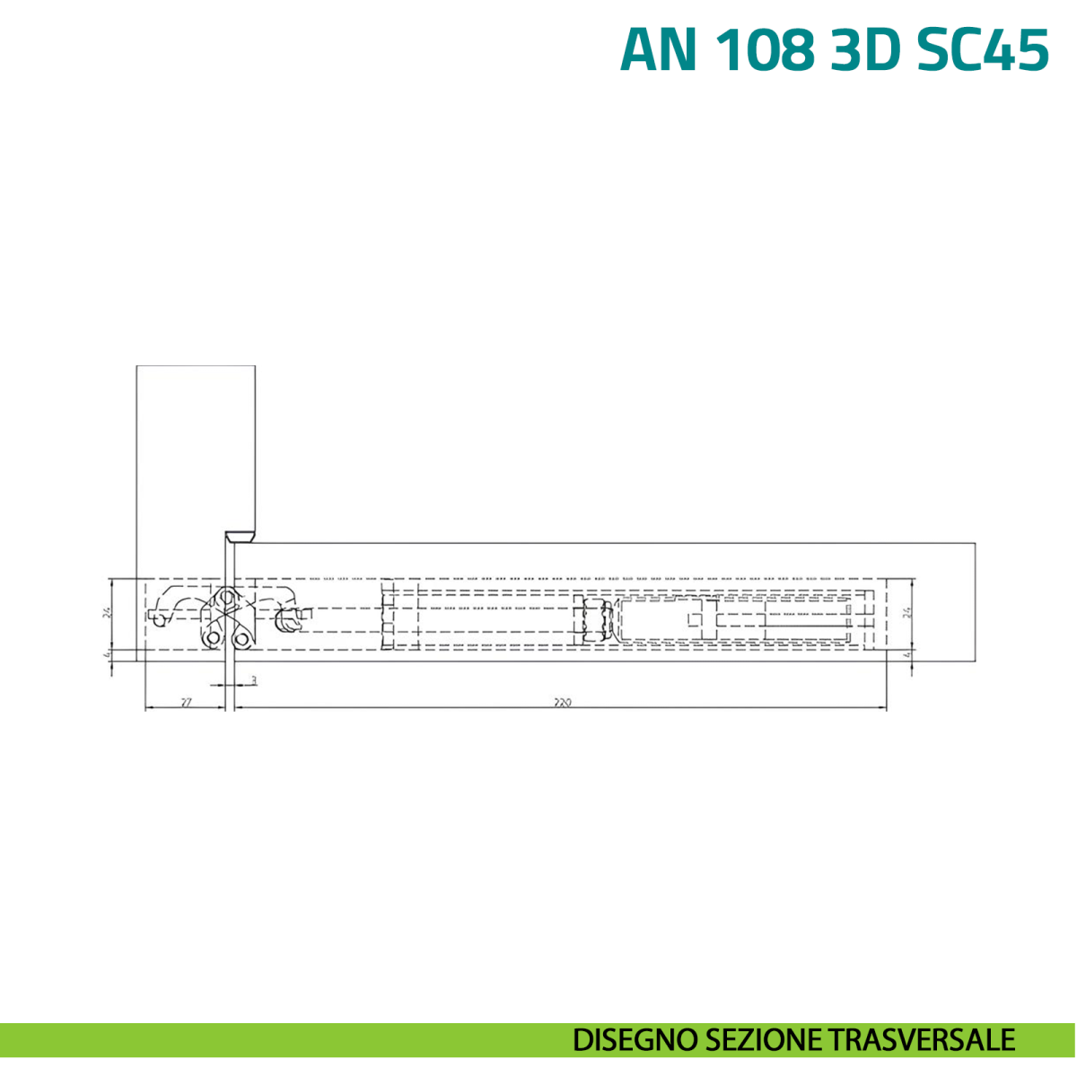 La cerniera a scomparsa Anselmi AN 108 3D SC45 con sistema di chiusura ammortizzato è progettata per garantire una chiusura automatica fluida e silenziosa su porte interne a filo con peso fino a 45 kg. Grazie alla sua struttura completamente invisibile e al design compatto, si integra perfettamente in contesti residenziali moderni ed eleganti. Ideale per telai in legno o alluminio, la AN 108 3D SC 45 è dotata di forza di chiusura regolabile anche a porta già installata, offrendo la massima flessibilità in fase di montaggio. La sua installazione è consigliata al centro della porta, in corrispondenza della serratura, preferibilmente magnetica, e deve essere utilizzata in combinazione con le cerniere compatibili della gamma Anselmi. Realizzata in zama, presenta dimensioni compatte: altezza 110 mm, larghezza 24 mm per elemento anta e telaio, con diametro fresa di 16 mm e anello guida da 27 mm. L’angolo di apertura a 180° consente un’apertura ampia e fluida, mentre il sistema integrato assicura una chiusura morbida, controllata e duratura nel tempo. Perfetta per ambienti dove il dettaglio e la funzionalità si incontrano, la Anselmi AN 108 3D SC 45 rappresenta una soluzione tecnica affidabile per un’esperienza di chiusura evoluta, discreta ed elegante.