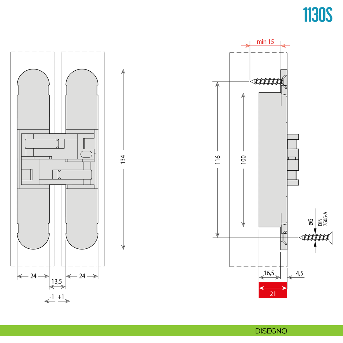 La cerniera invisibile regolabile su tre assi Ceam 1130S rappresenta una soluzione di alta qualità per porte interne, ideale per chi desidera unire estetica, funzionalità e resistenza. Realizzata in Zama, è disponibile nelle finiture Zama Nichelato e Zama Verniciato Argento, adattabili a diversi contesti di arredo. Con una lunghezza totale di 134 mm e una profondità di 21 mm, è progettata per porte con spessore minimo di 30 mm. Grazie alla regolazione tridimensionale indipendente (altezza, profondità e laterale), consente un perfetto allineamento della porta, migliorando estetica e funzionalità. La portata di questa cerniera permette di sostenere fino a 60 kg con 3 cerniere, rendendola adatta a porte sia destre che sinistre. Inoltre, la certificazione di prodotto nr.020AW/0 con classificazione 3-6-1-3/3-4 e l’attestato di resistenza al fuoco garantiscono affidabilità e sicurezza nel tempo. Le regolazioni precise consentono movimenti accurati: altezza -2,5/+2,5 mm, laterale -1/+1 mm, profondità -1,5/+2,5 mm, assicurando un montaggio semplice, rapido e altamente performante.
