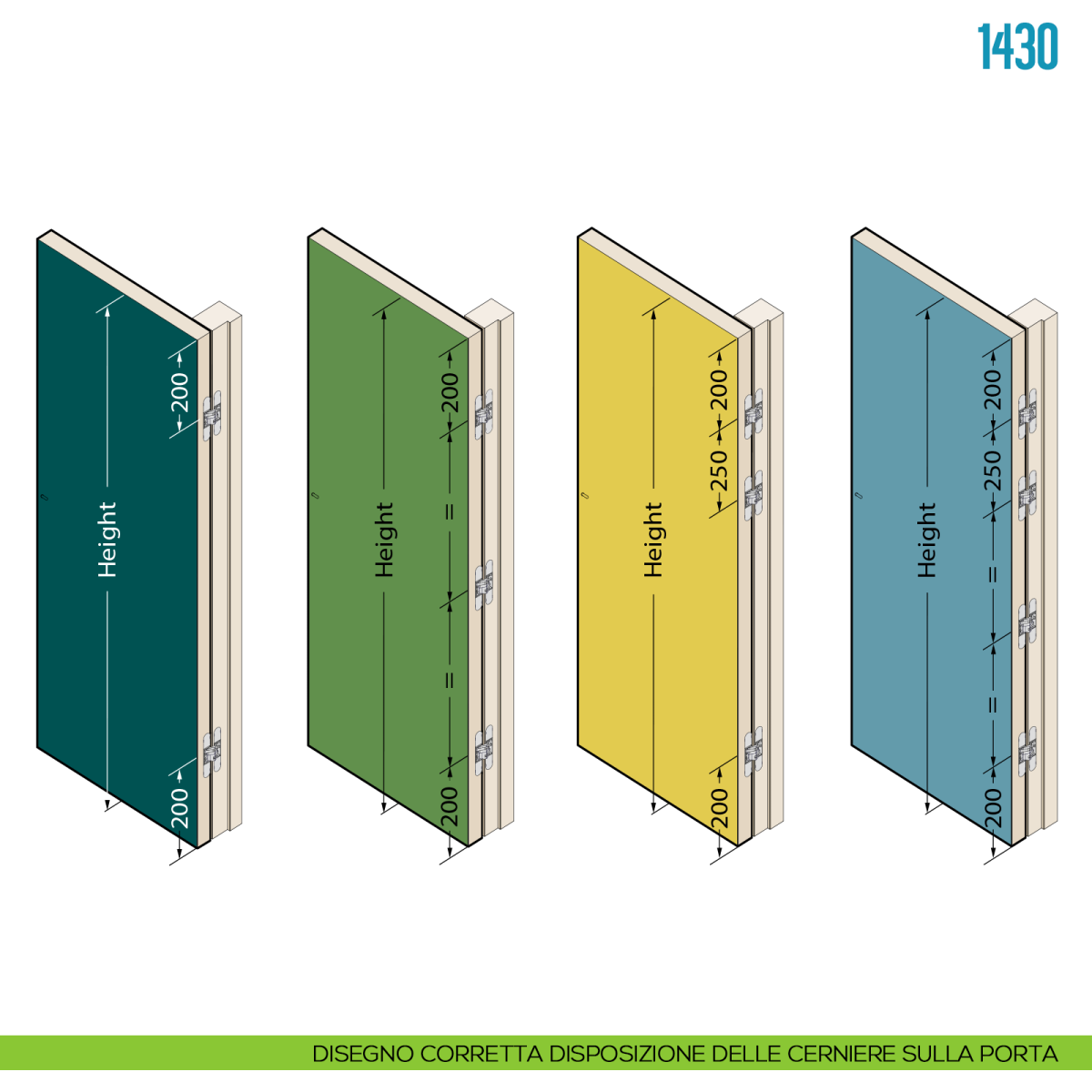 - Portata: 3 cerniere 65 kg asimmetriche / 3 cerniere 60 kg