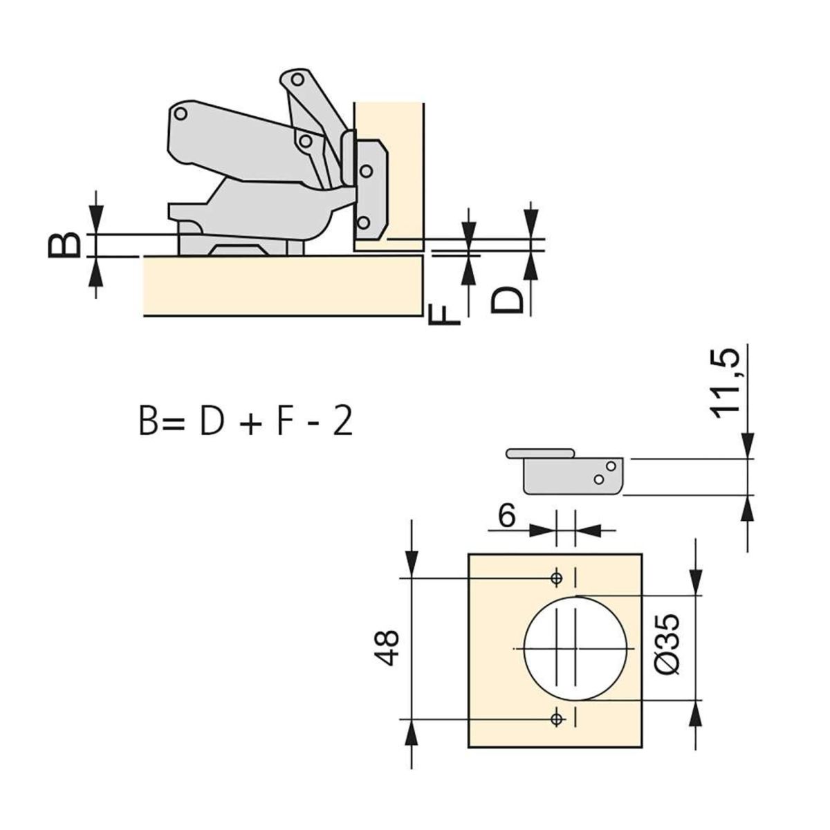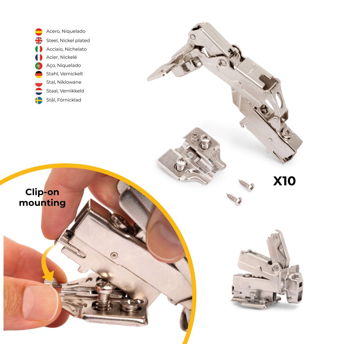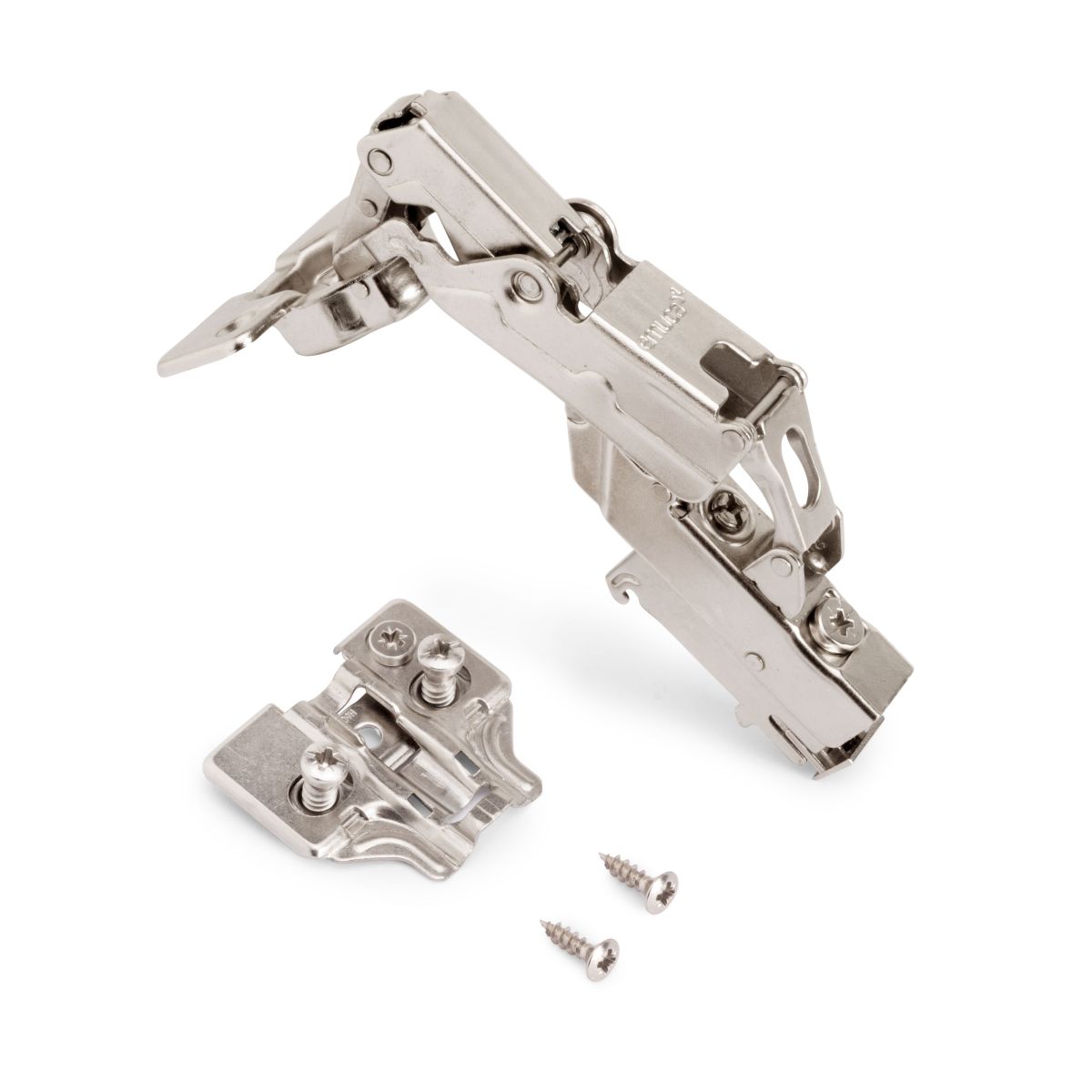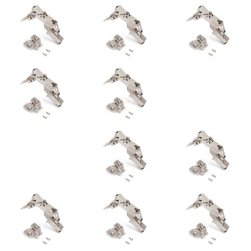 Allo stesso tempo è molto facile l'istallazione grazie al sistema automatico di montaggio a clip della cerniera alla basetta. Entrambi dispongono di vite eccentrica per la regolazione rapida e comoda.. Il fissaggio della basetta avviene con vite Euro che necessita di un foro diamentro 5x 12 mm nella spalla del mobile.