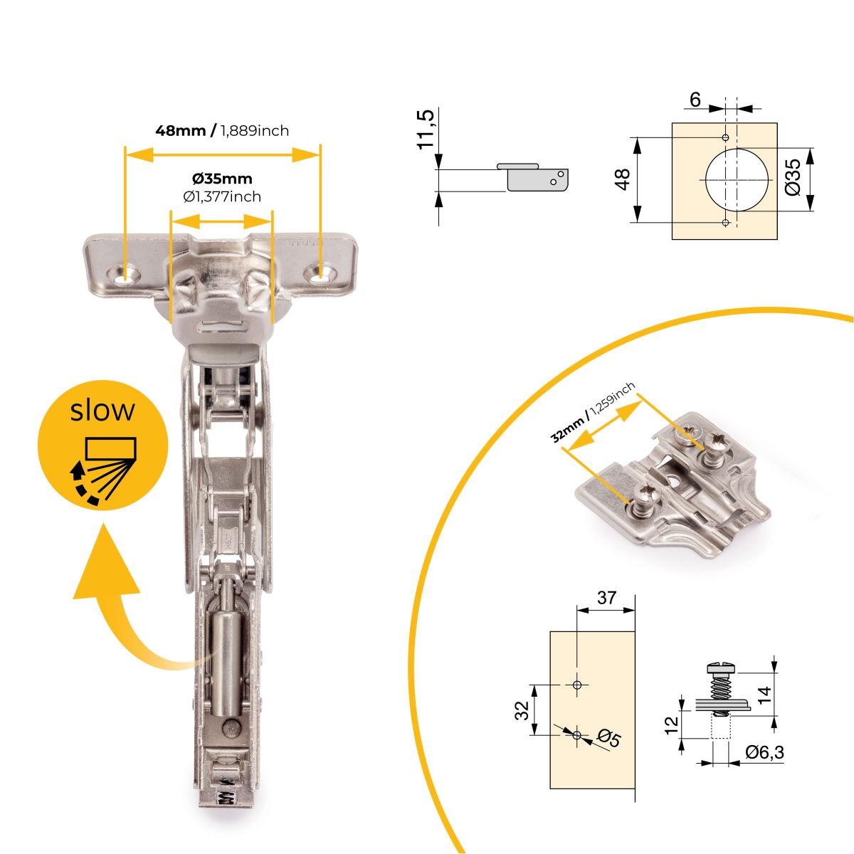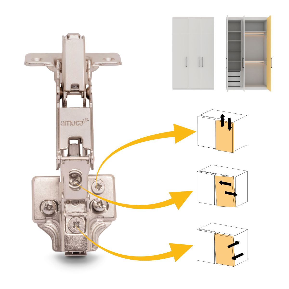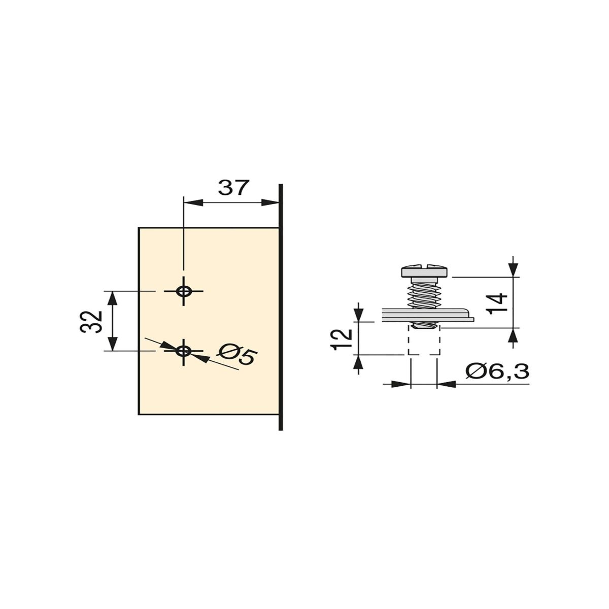 Allo stesso tempo è molto facile l'istallazione grazie al sistema automatico di montaggio a clip della cerniera alla basetta. Entrambi dispongono di vite eccentrica per la regolazione rapida e comoda.. Il fissaggio della basetta avviene con vite Euro che necessita di un foro diamentro 5x 12 mm nella spalla del mobile.