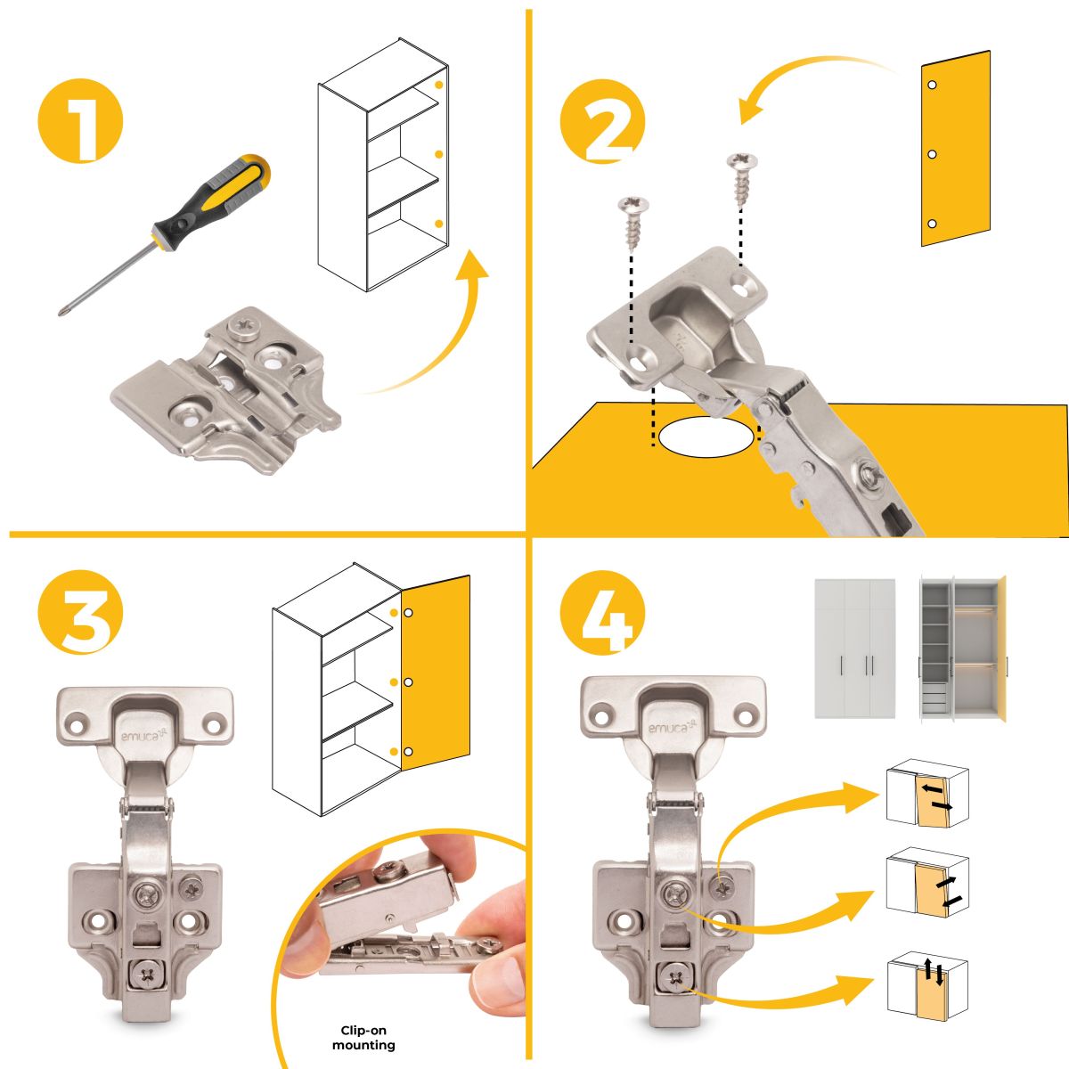 Allo stesso tempo è molto facile l'istallazione grazie al sistema automatico di montaggio a clip della cerniera alla basetta. Inoltre entrambi dispongono di vite eccentrica per una regolazione rapida e comoda.