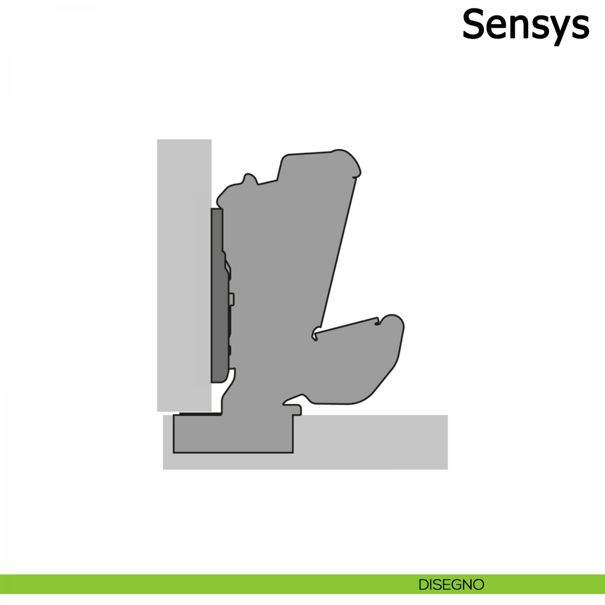 Cerniera Hettich serie Sensys ad angolo W90 ante parallele, con ammortizzatore incorporato per ante a filo, angolo di apertura 90°, schema di foratura TH 52x5,5 mm, con fissaggio a viti.