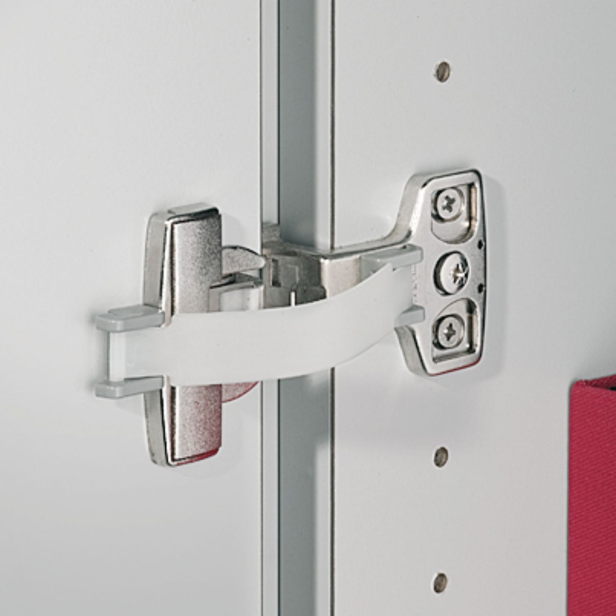 Limitatore d'angolo d'apertura 110° per cerniera per mobile da ufficio Hafele Aximat 100 SM in plastica trasparente.