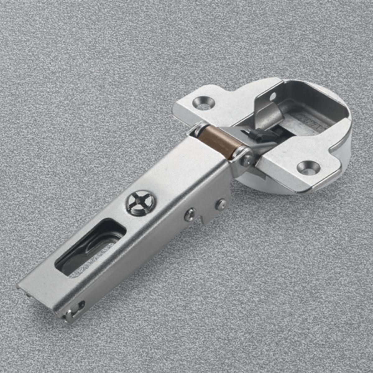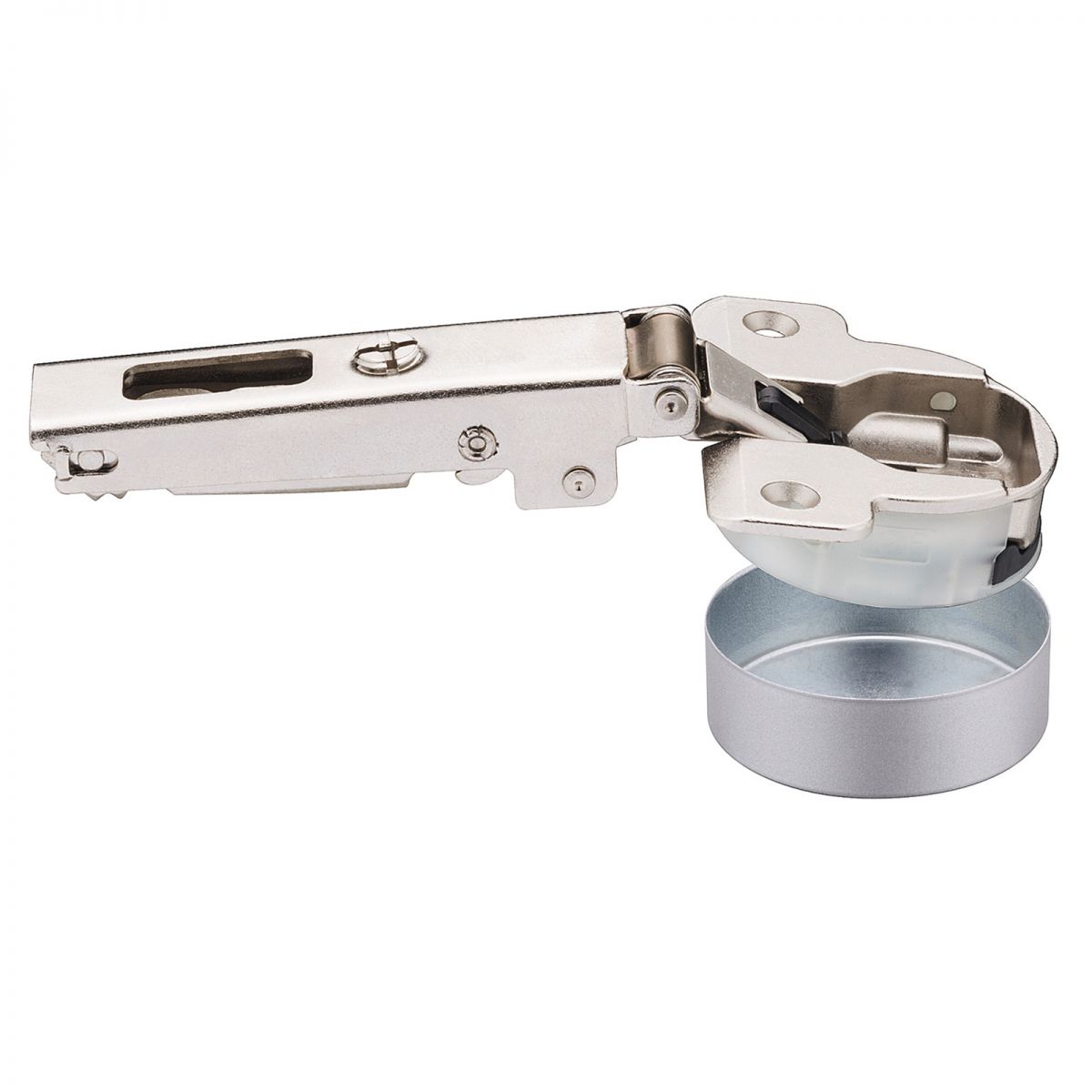 Cerniera Salice C1Z6AE9 Serie Silentia+, per ante con telaio in alluminio a partire da 19 mm di larghezza, apertura 105 gradi, collo 0 per montaggio ad angolo, diametro foratura 35,7 mm, con ammortizzatore regolabile integrato nella gabbia della cerniera.