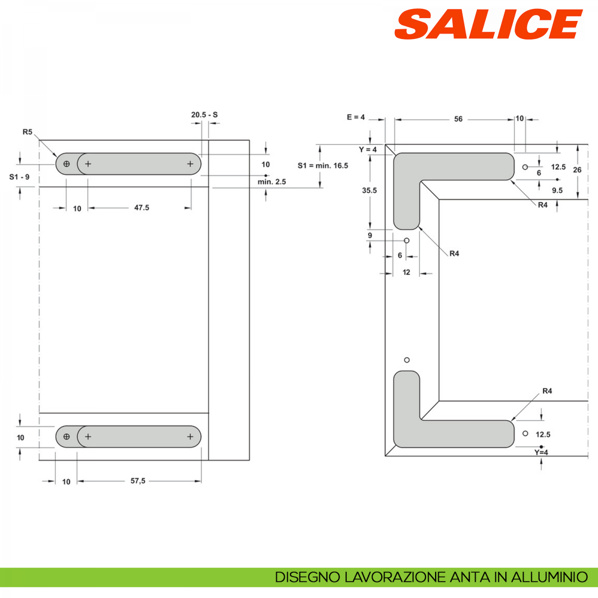 - Esecuzione: per ante in legno o con telaio in alluminio spessore minimo 18 mm